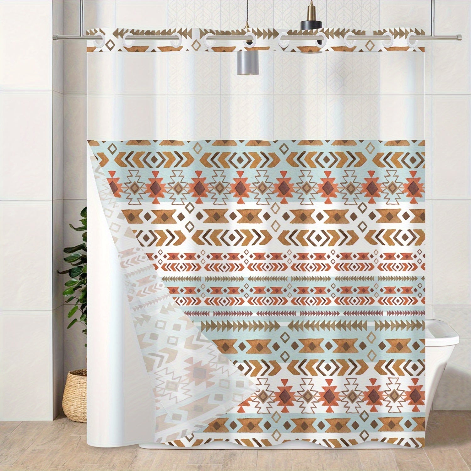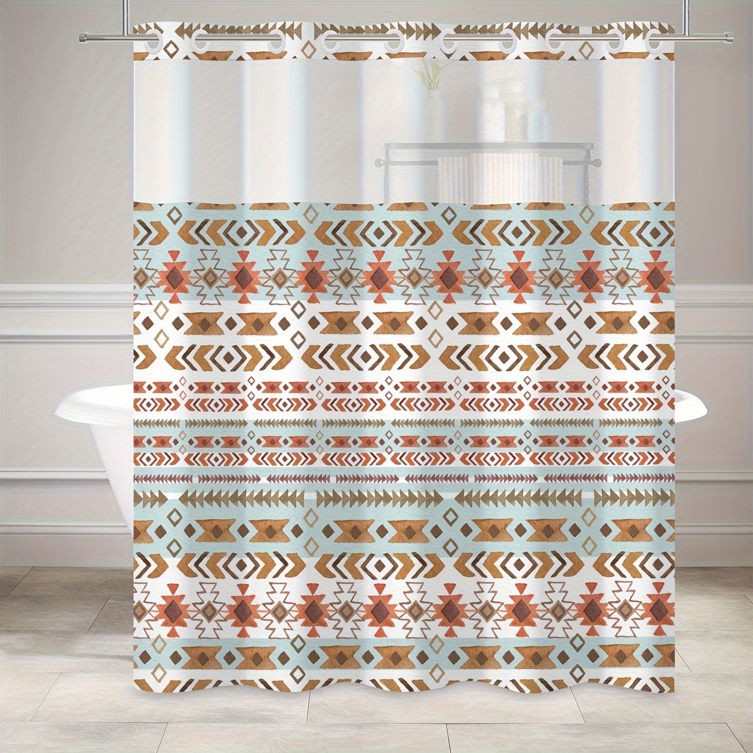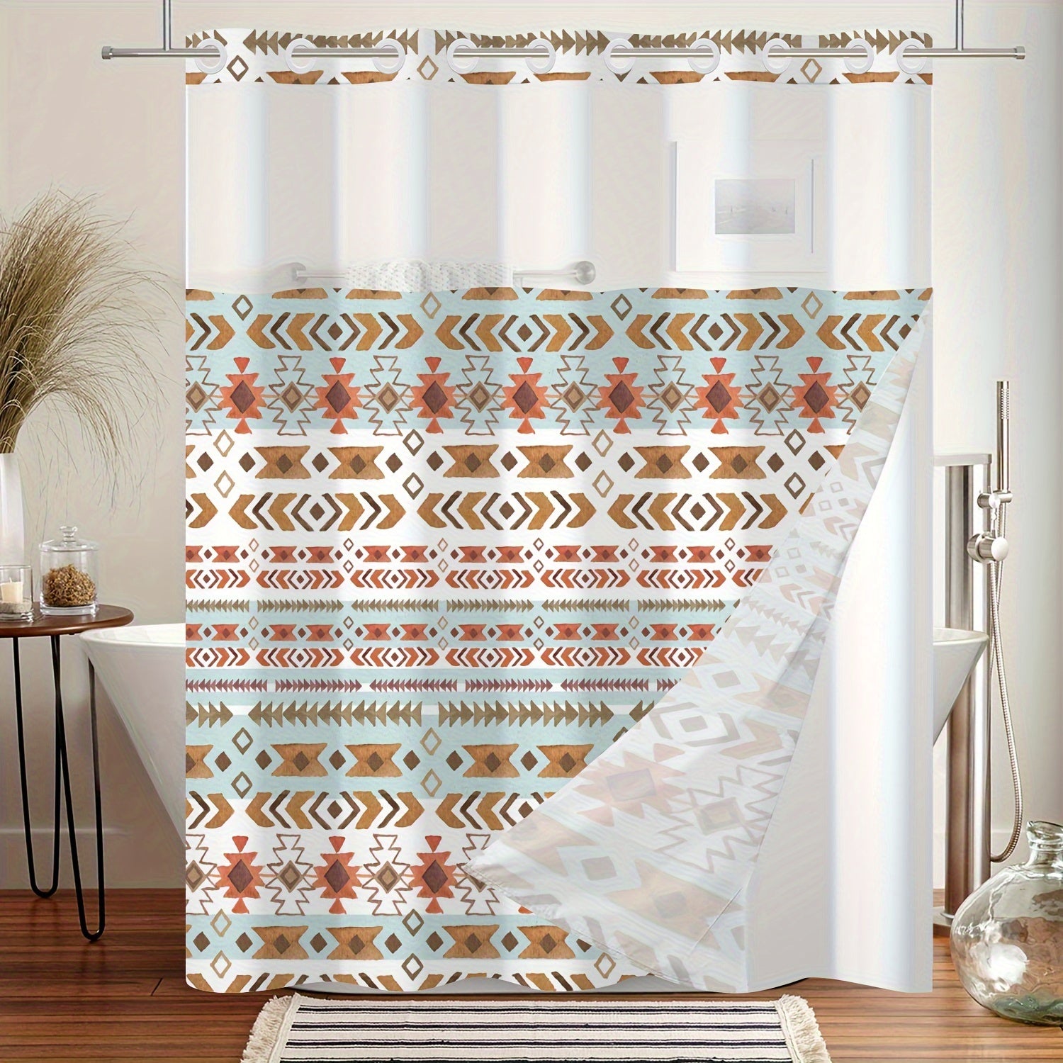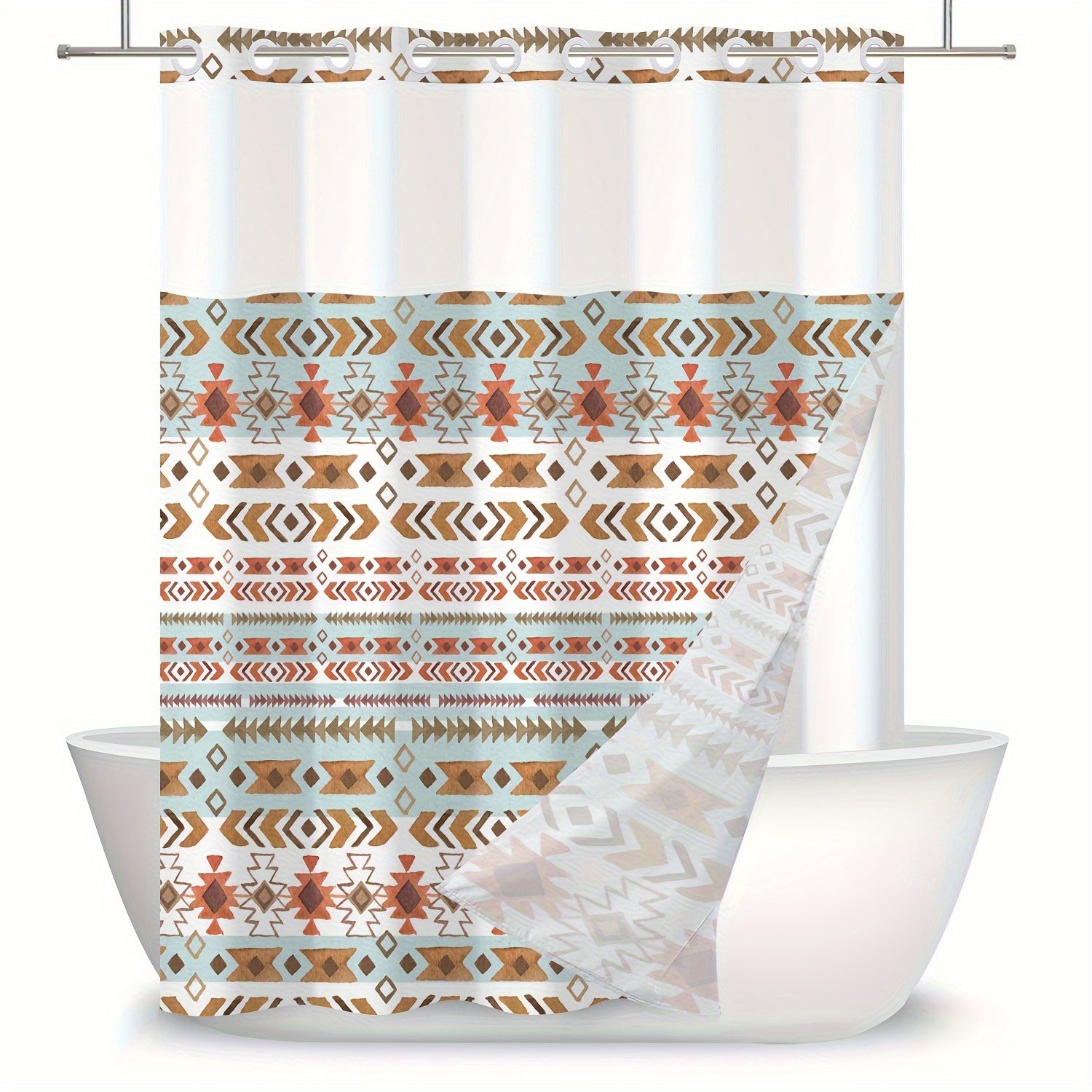 Boho Shower Curtain Set, No Hook Shower Curtain And Liner Set, Bohemian Abstract Shower Curtain With See Through Mesh Top Window, Gray And Brown, For Hotel Bath Curtain Bathroom Decor 71x74 Inches
