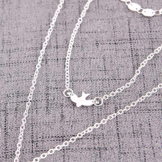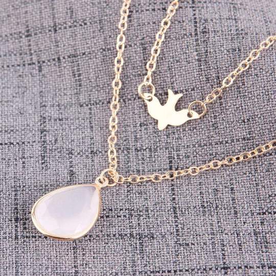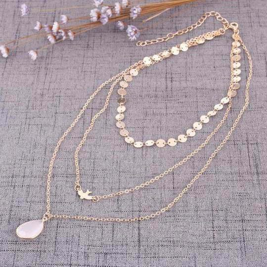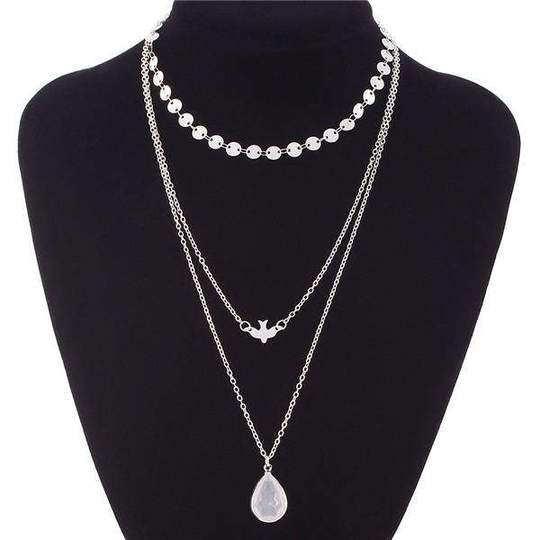 This gorgeous multi-layer necklace ties together any outfit. Combining a gold coin choker, dove pendant, and stone pendant necklace, this is truly the perfect necklace to dress up or dress down.
