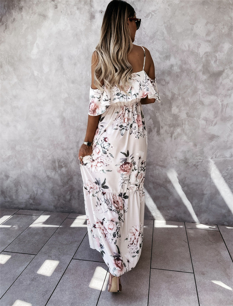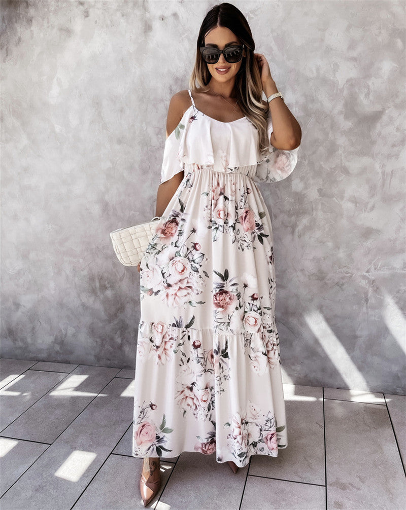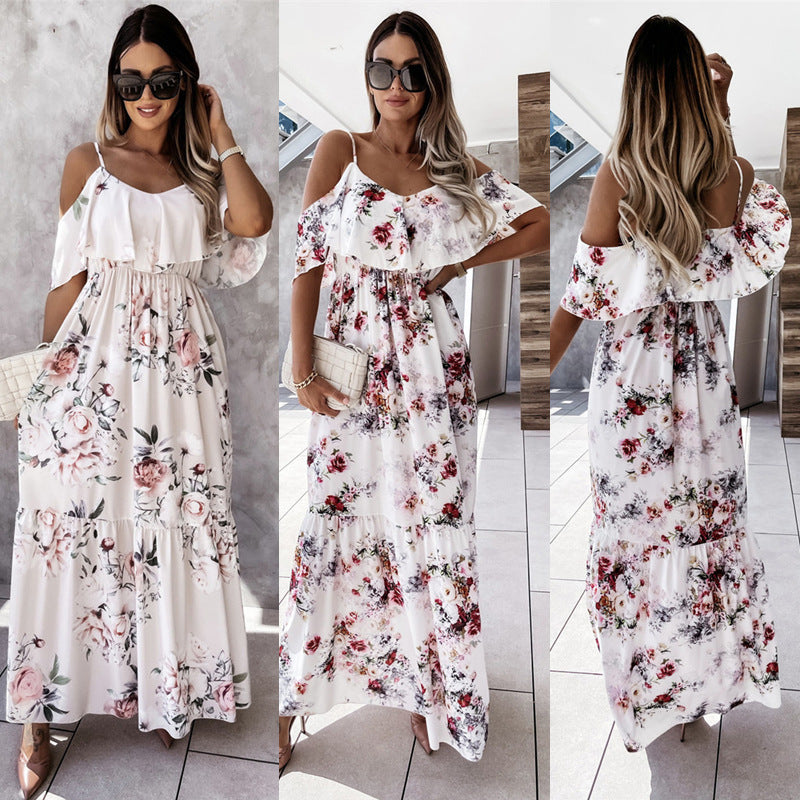 Off-the-shoulder Long Spaghetti-strap Floral Print Large Swing Dress