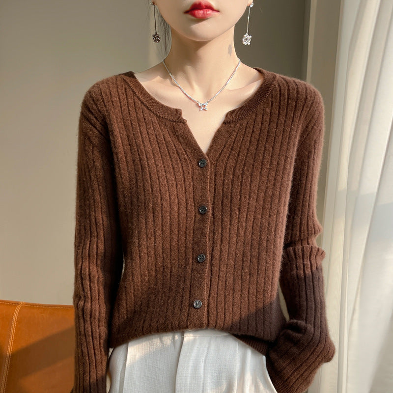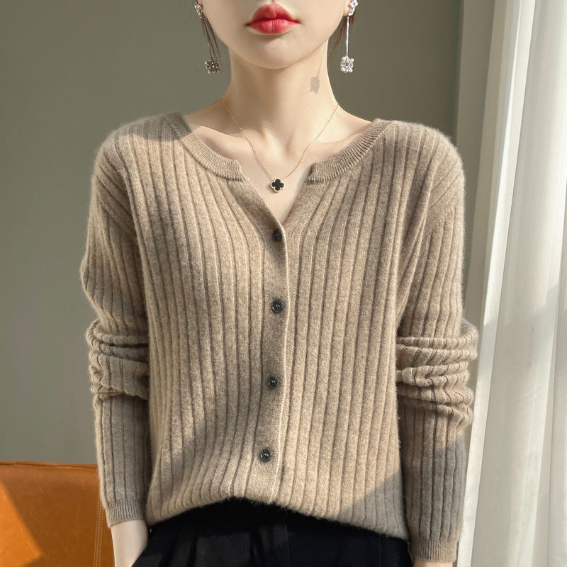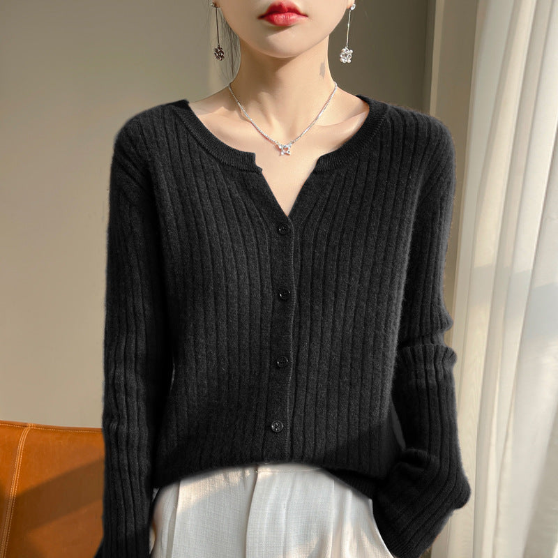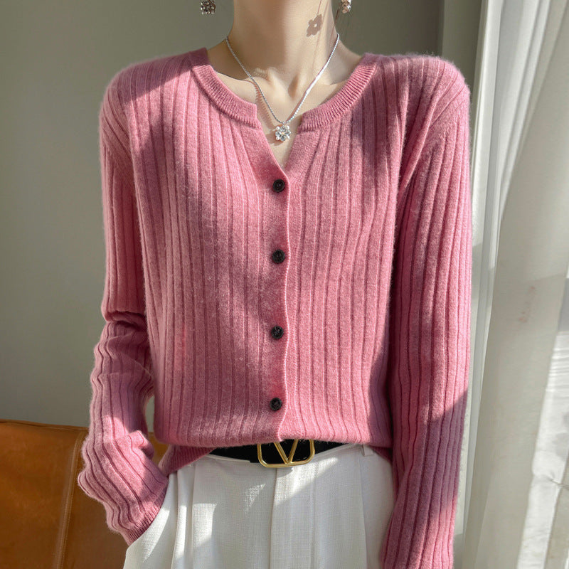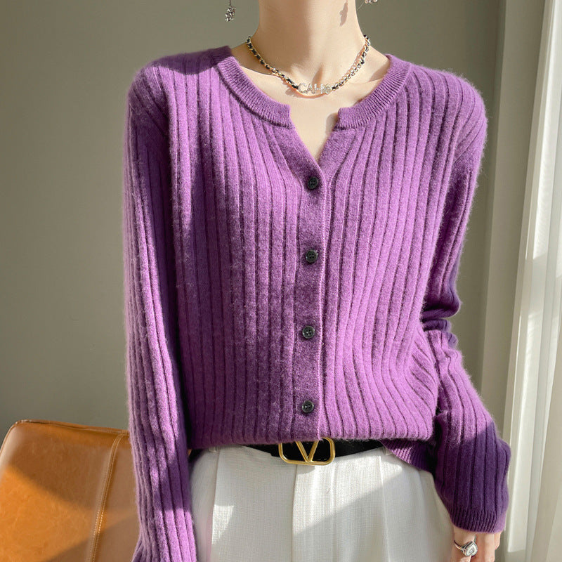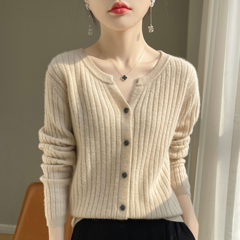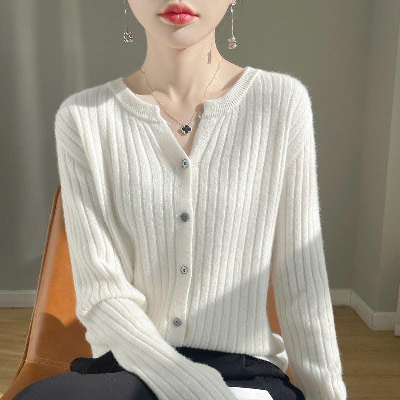 Round Neck Slim-fit Short Striped Solid Color Knitted Cardigan Jacket