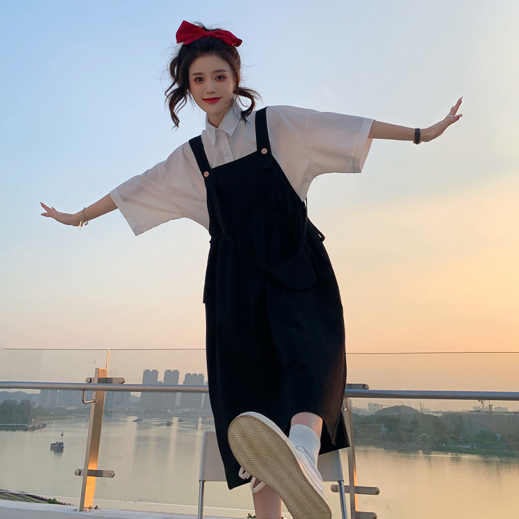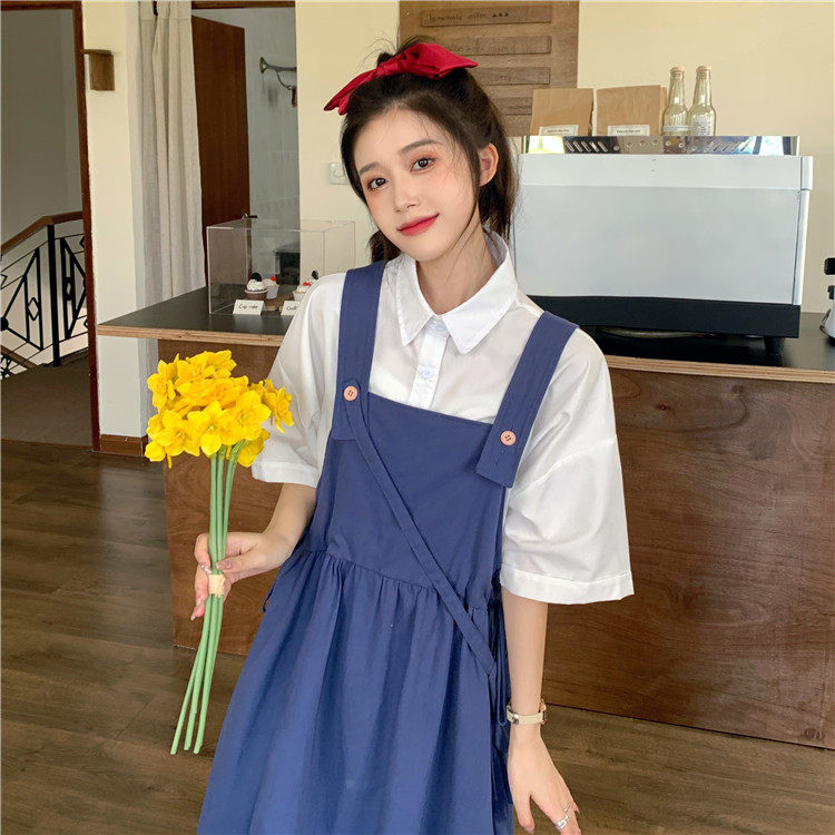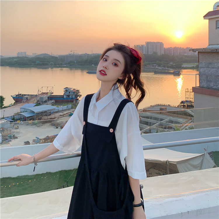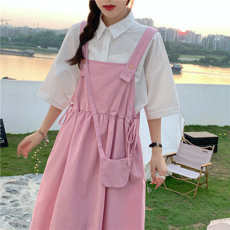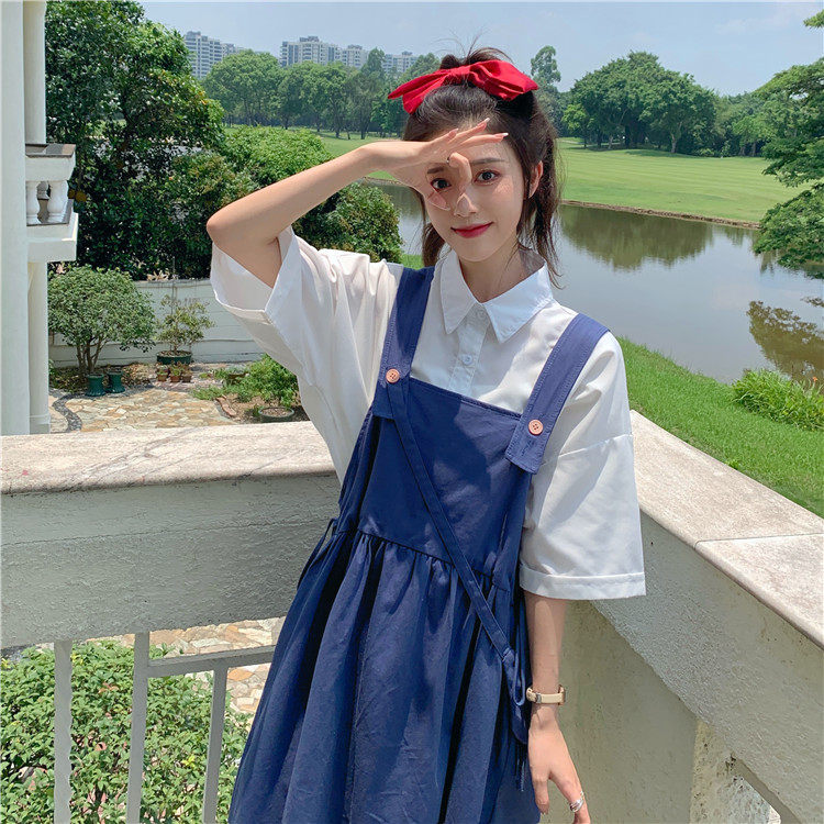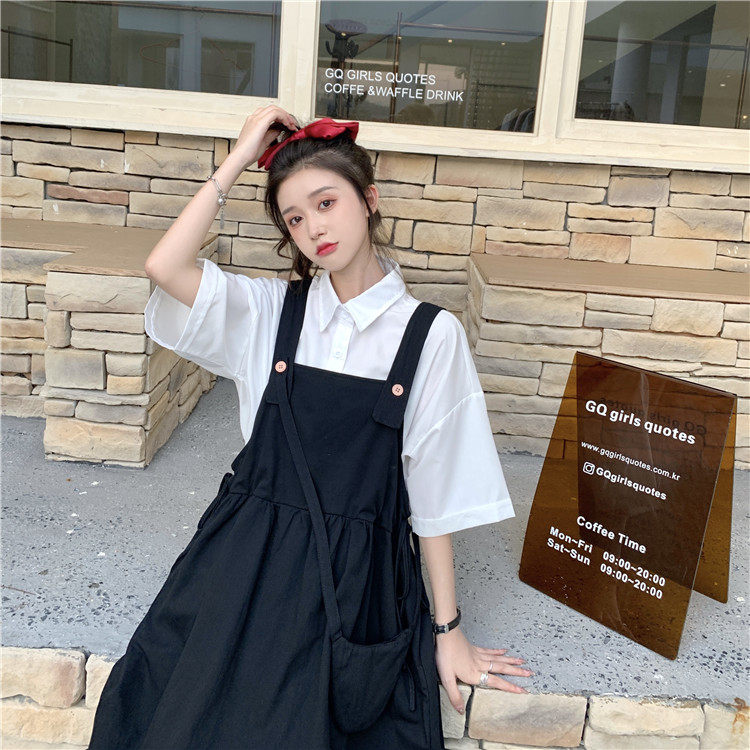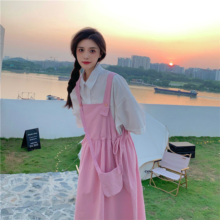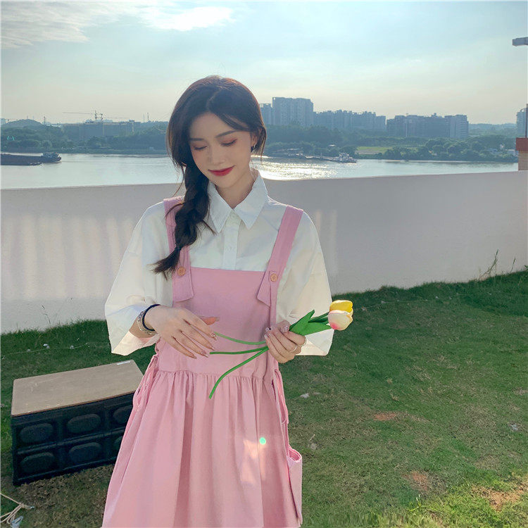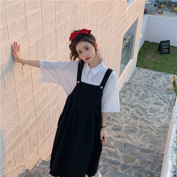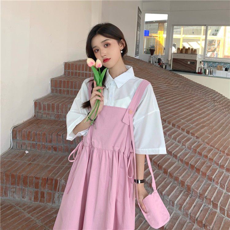 Color classification: White shirt + two-piece pink strap skirt (send bag) Skirt (send bag) One-piece blue suspender skirt (send bag) One-piece black suspender skirt (send bag)