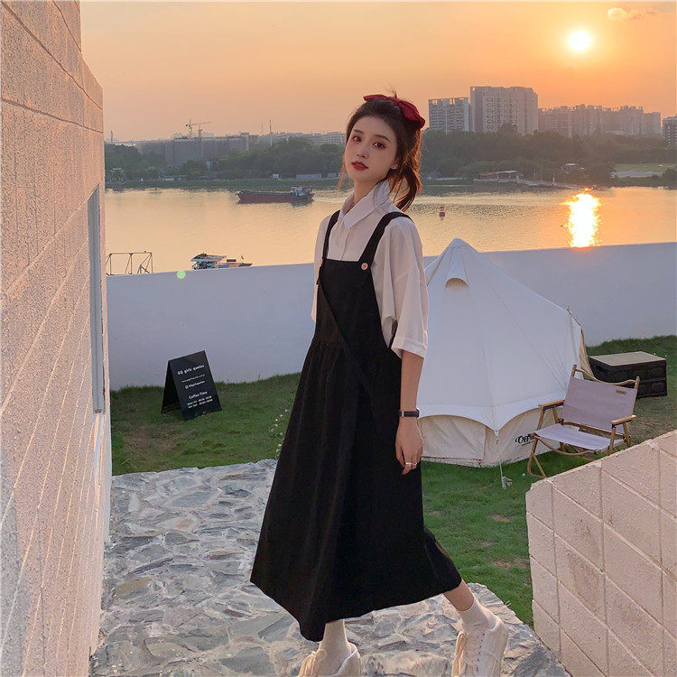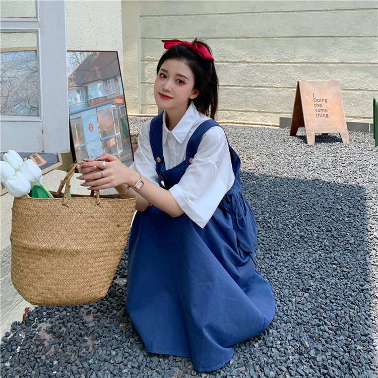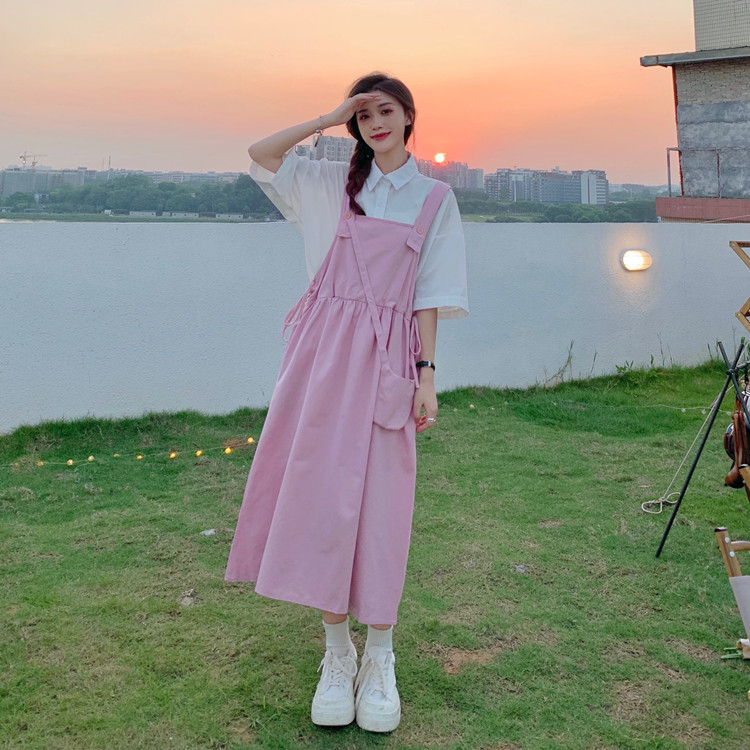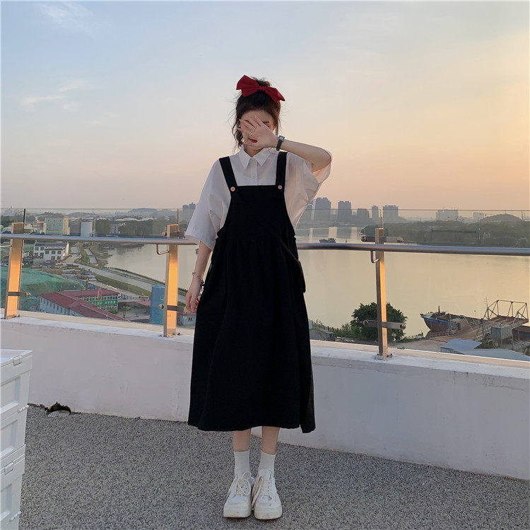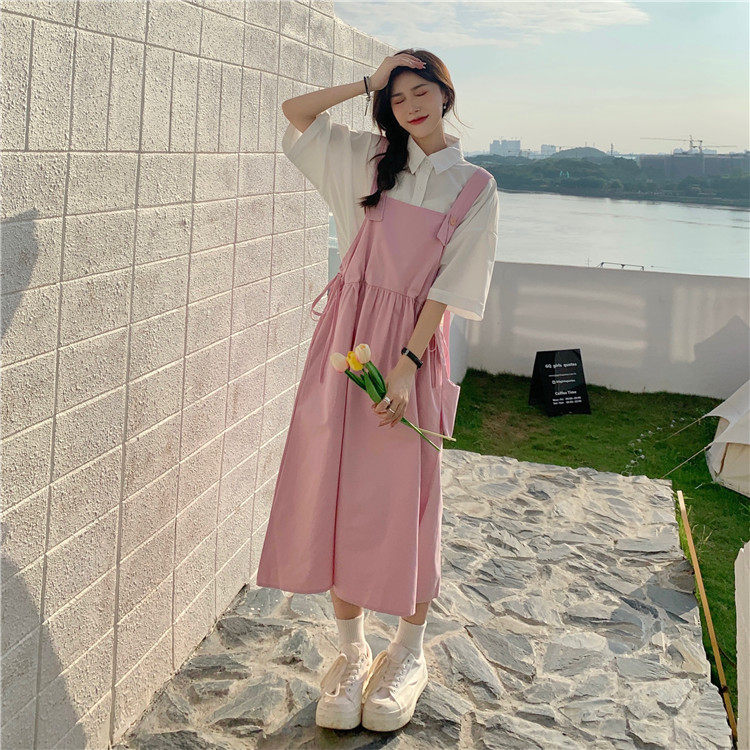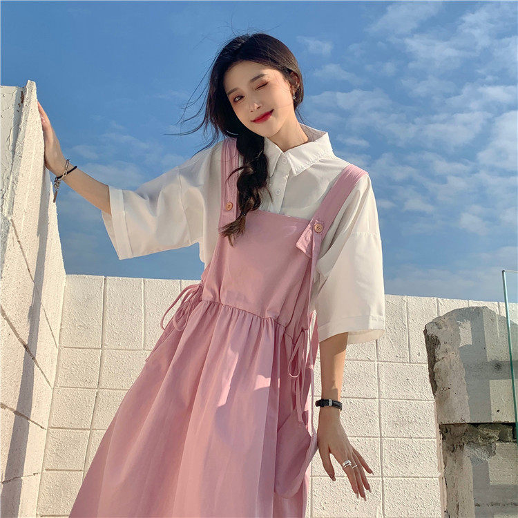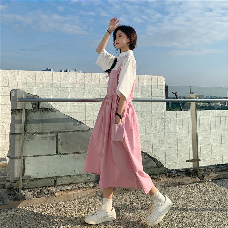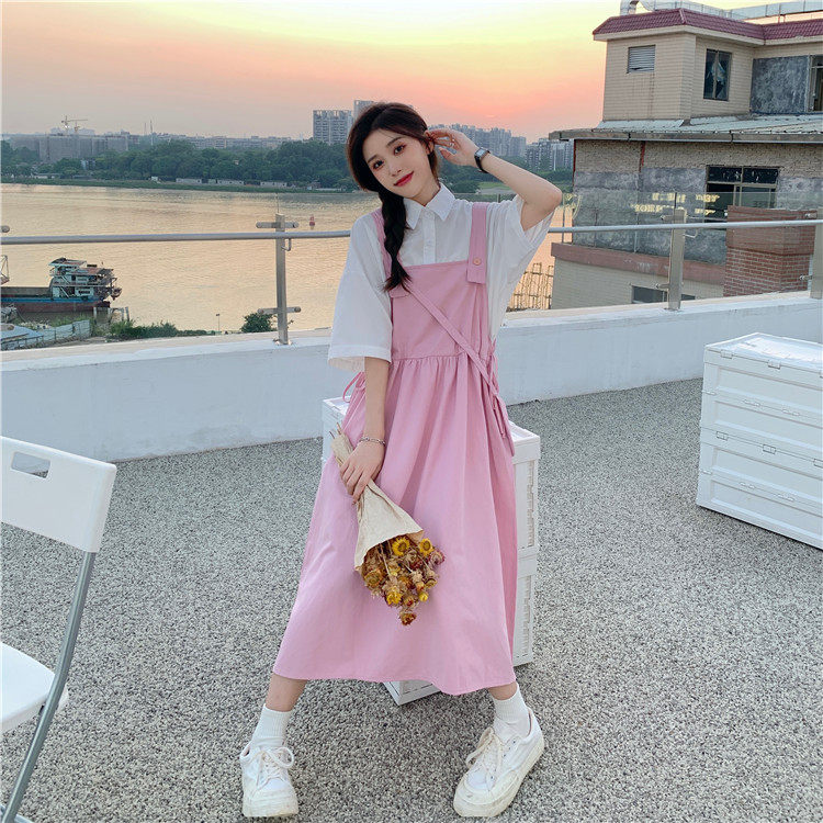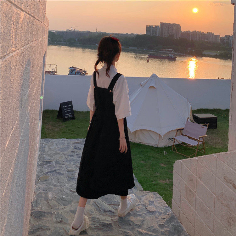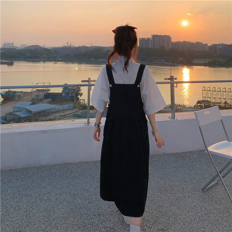 Color classification: White shirt + two-piece pink strap skirt (send bag) Skirt (send bag) One-piece blue suspender skirt (send bag) One-piece black suspender skirt (send bag)