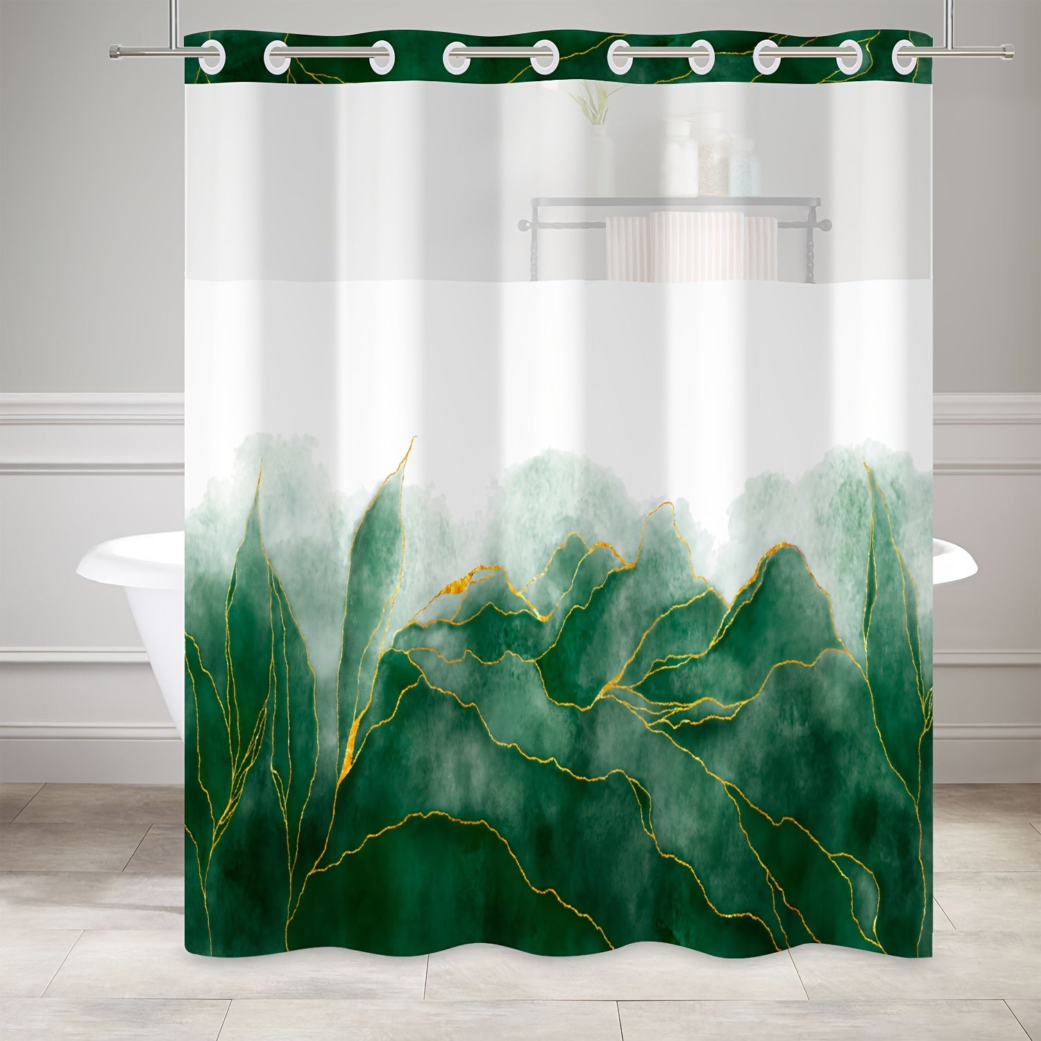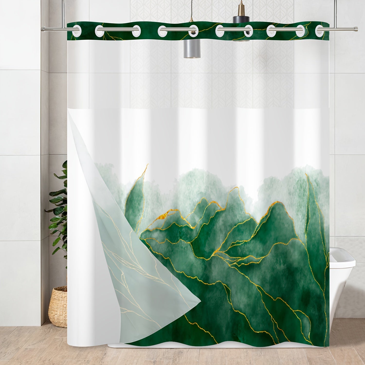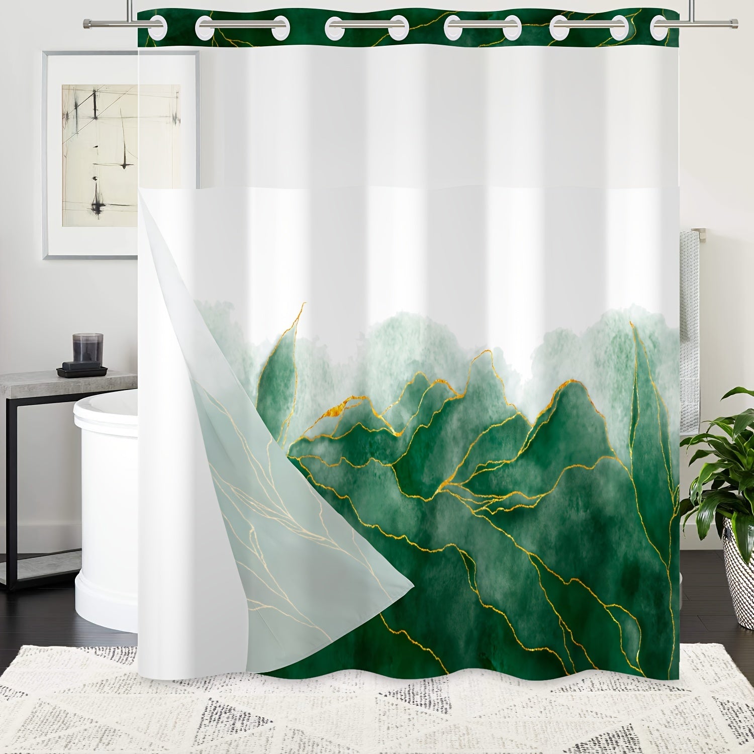 Green Abstract Marble Shower Curtain, Bohemian Abstract Mountain 3-in-1 Shower Curtain, Hook Free Shower Curtain With Stuck In Lining, 71x74 Inches