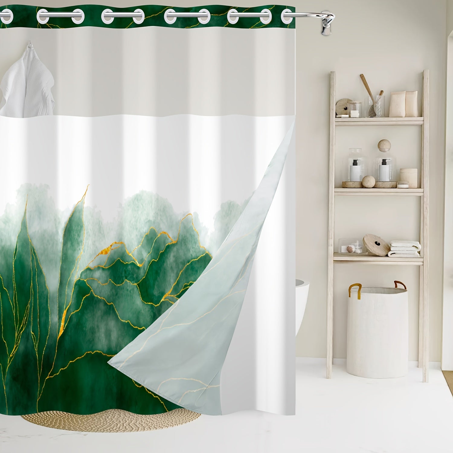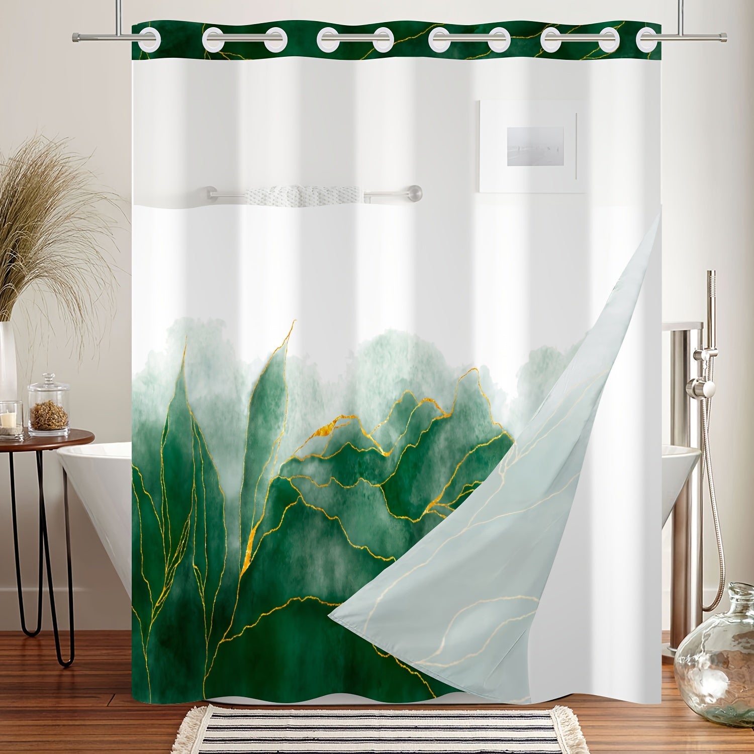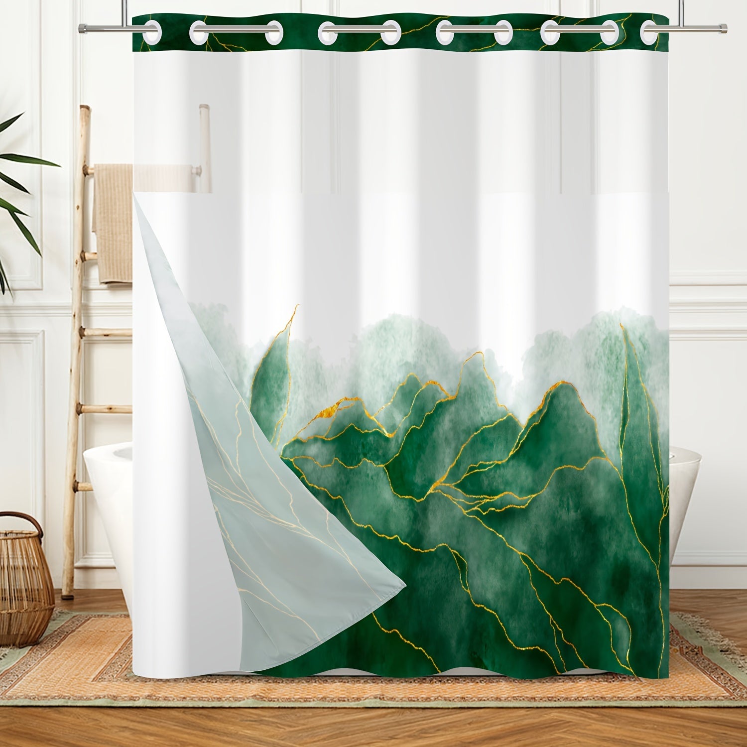 Green Abstract Marble Shower Curtain, Bohemian Abstract Mountain 3-in-1 Shower Curtain, Hook Free Shower Curtain With Stuck In Lining, 71x74 Inches