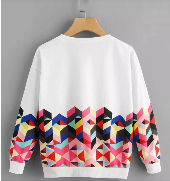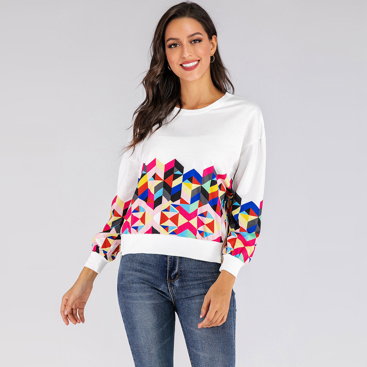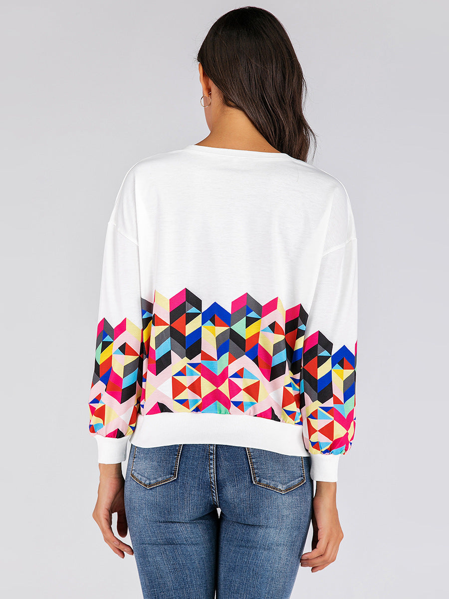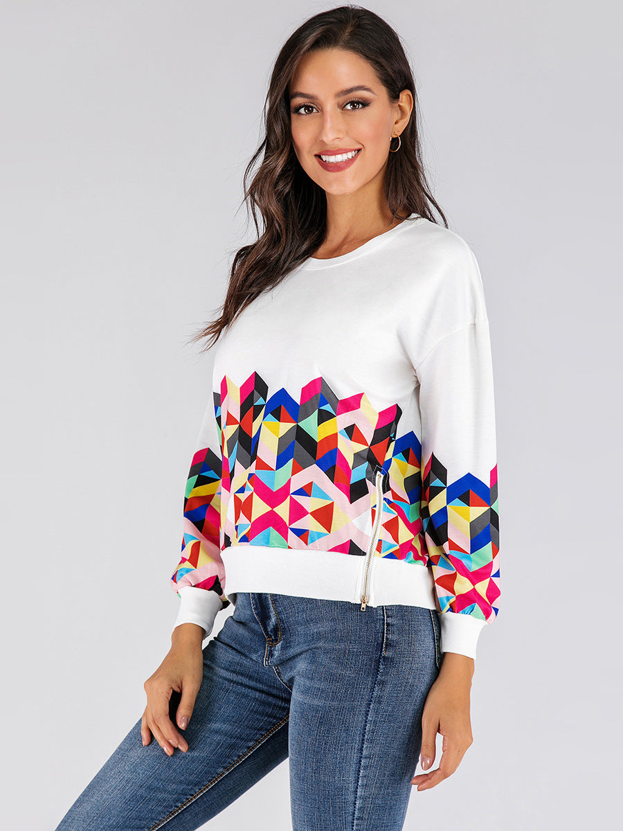 Women's round neck geometric printing zipper decoration long sleeve sweater