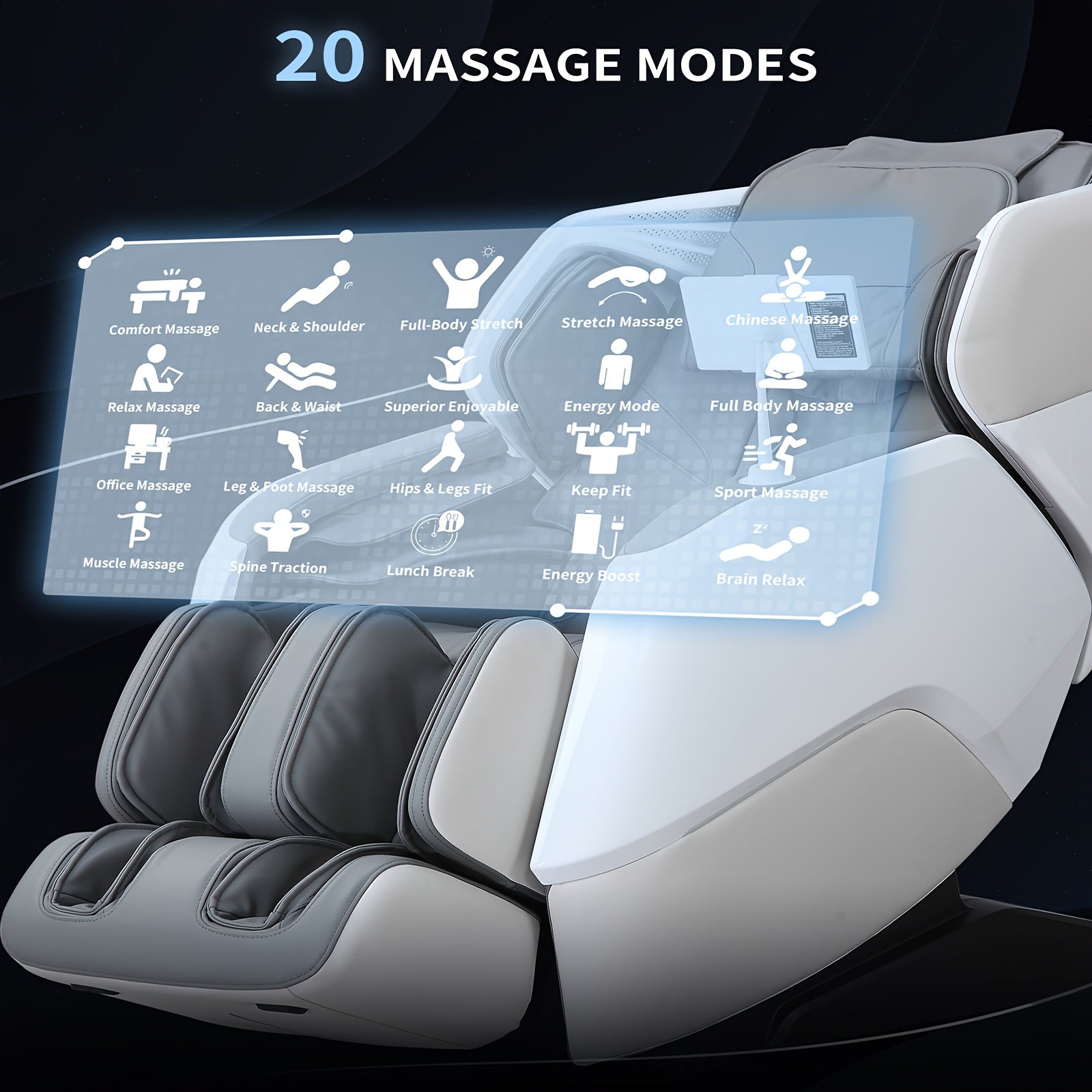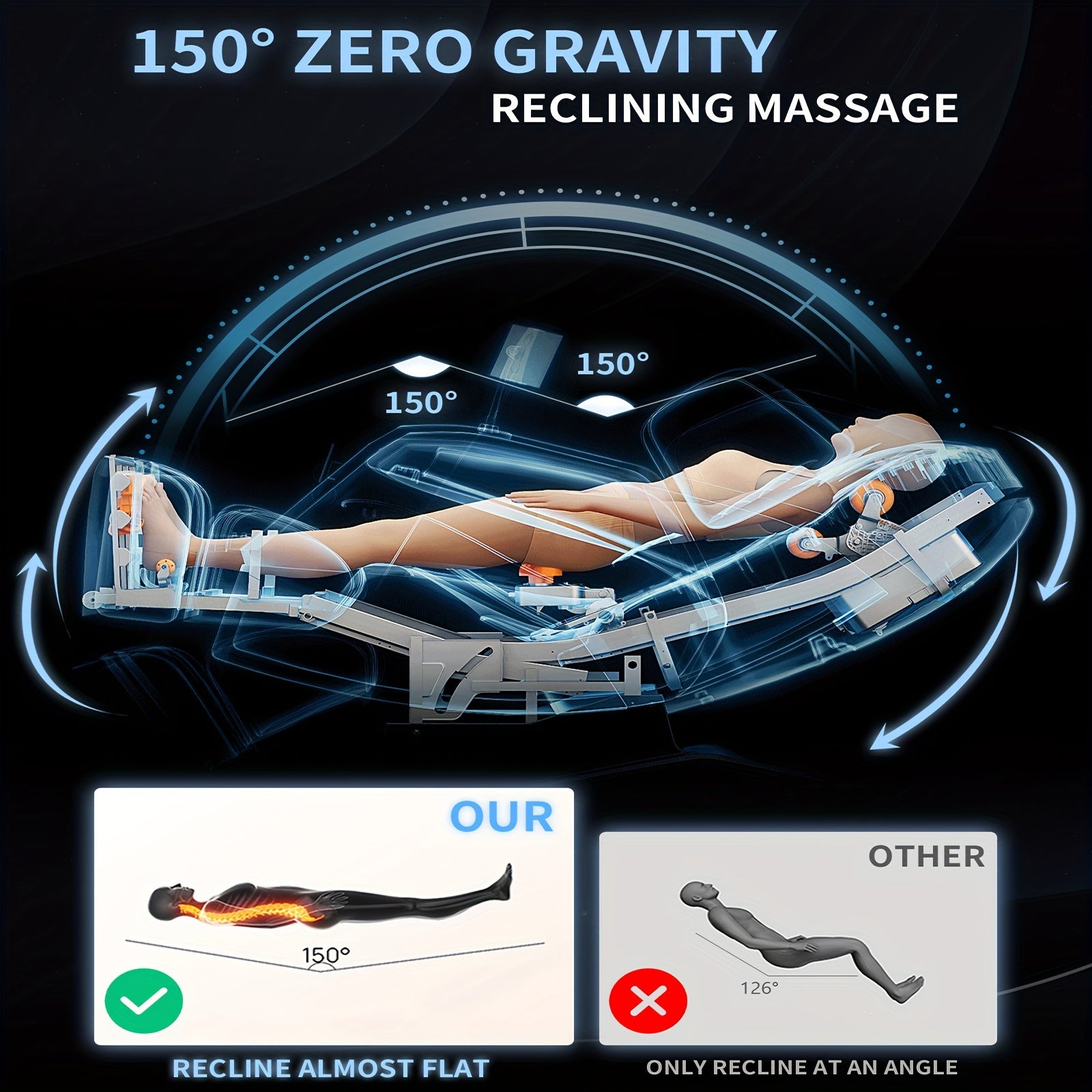 The 150° Zero Gravity Massage Chair is designed to perfectly fit the shape of your spine, offering a wide coverage massage with dual-end track extension. It provides a comfortable lying position customized for the human body, giving effective support to different body areas. Unlike typical inclined massages, this chair enables complete relaxation.