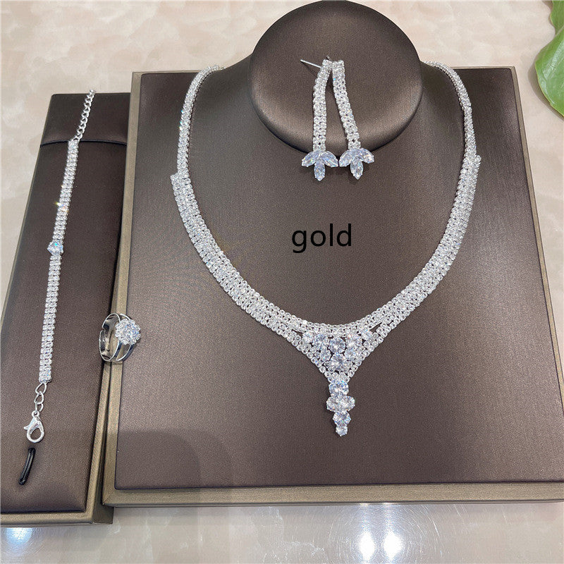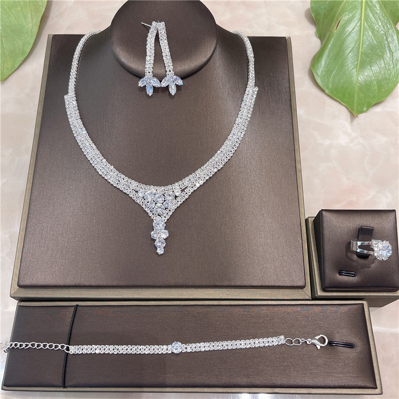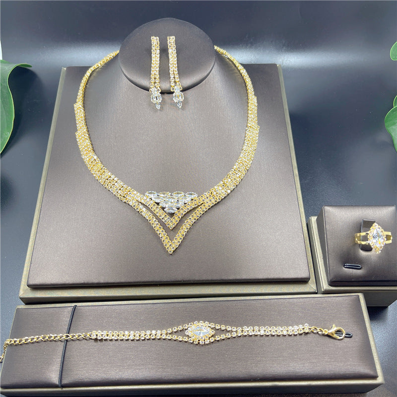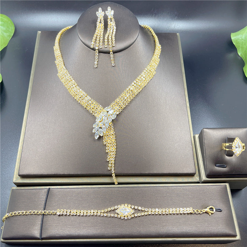 Fashion Luxury Rhinestone Earrings Necklace Ring Bracelet Four Piece Chain