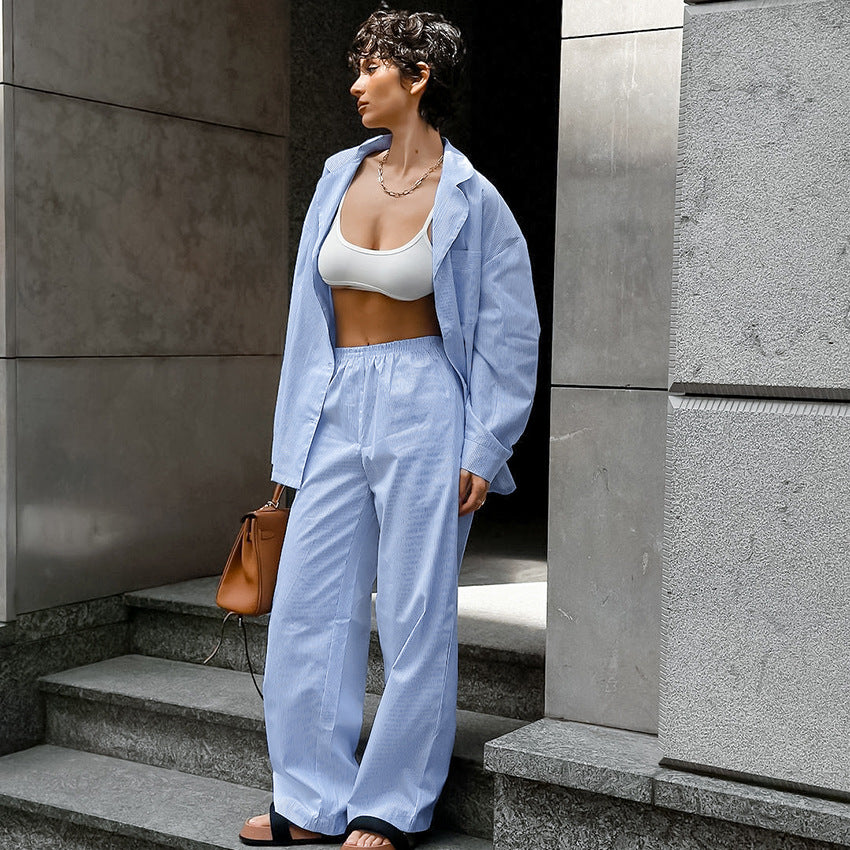 Blue Striped Women's Loose Long Sleeve Two-piece Suit