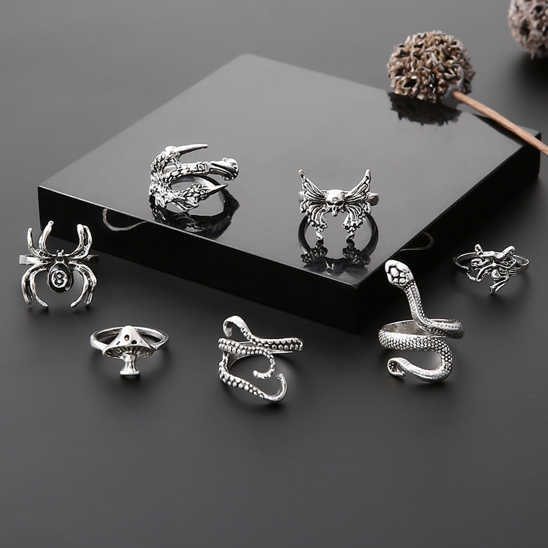 Halloween Retro Skull Snake Spider Octopus Animal Ring Set Of 7