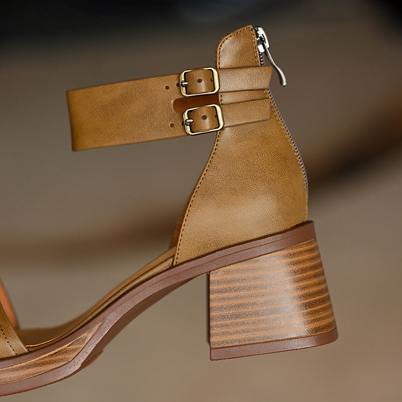 Chunky Heel Back Zip Platform French Style Mid Heel Wide Strap High Heel Shoes