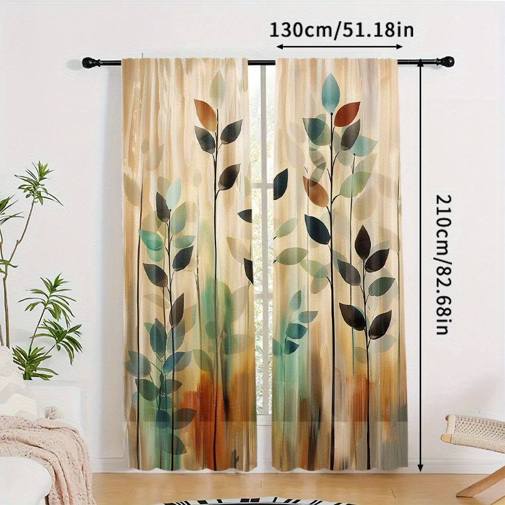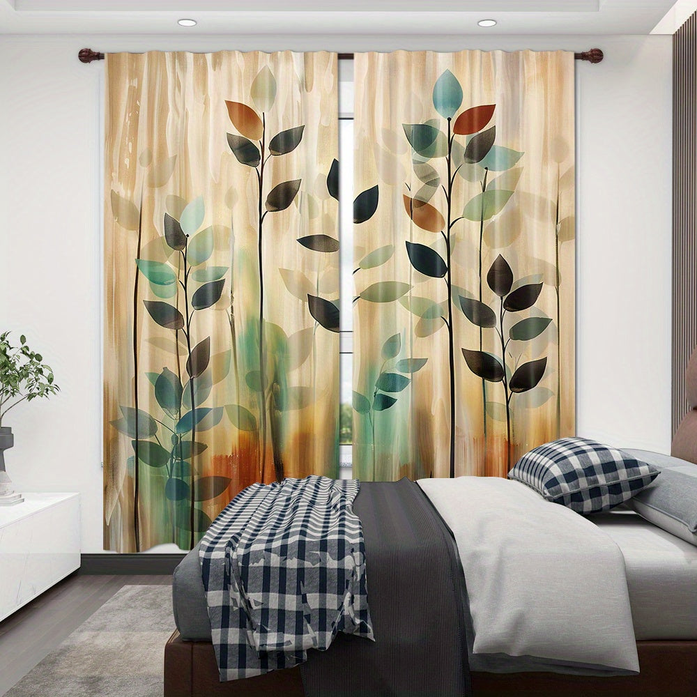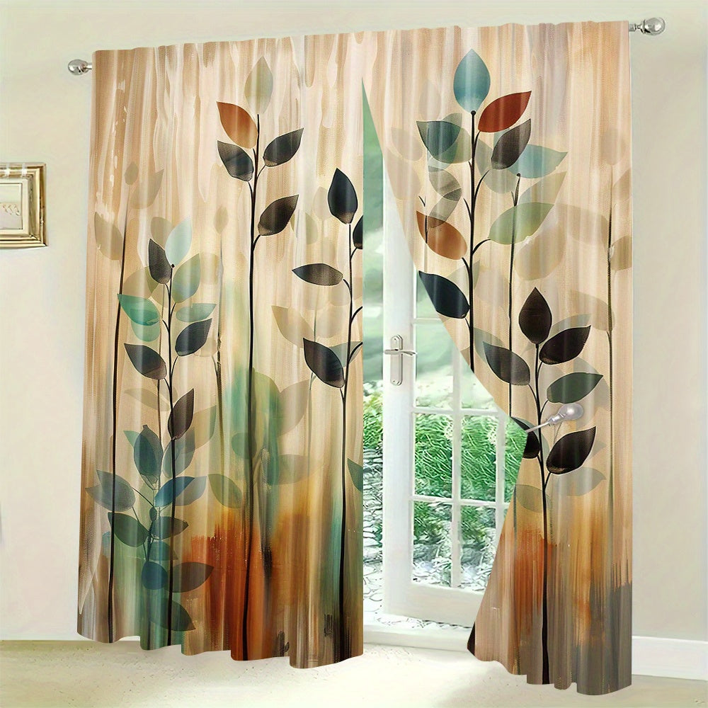 2-Piece Blackout Curtain Set with Artistic Leaf Print - Contemporary Polyester Woven Drapes for Bedroom, Living Room, Office - Rod Pocket Design, Machine Washable - Elegant Landscape-Themed Window Treatments