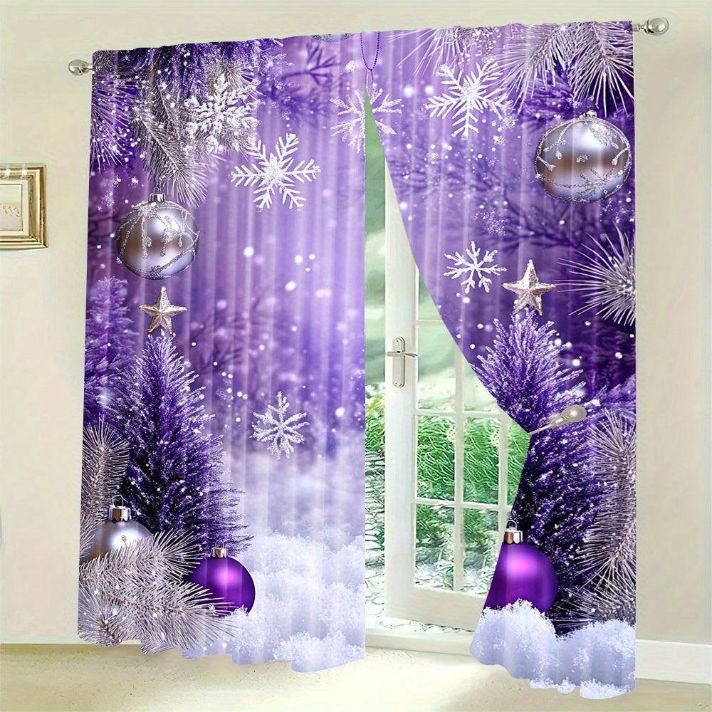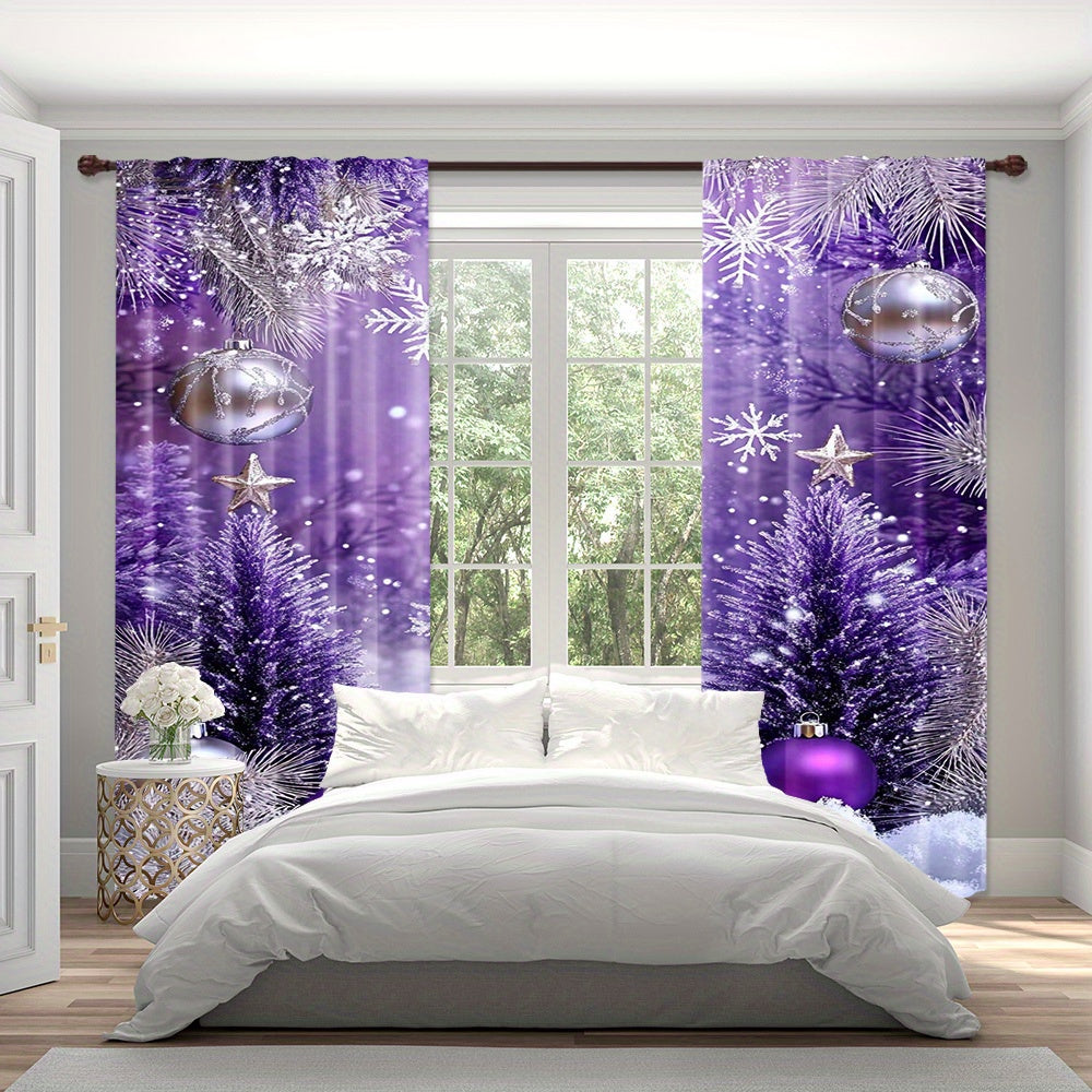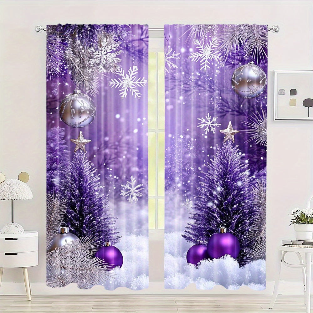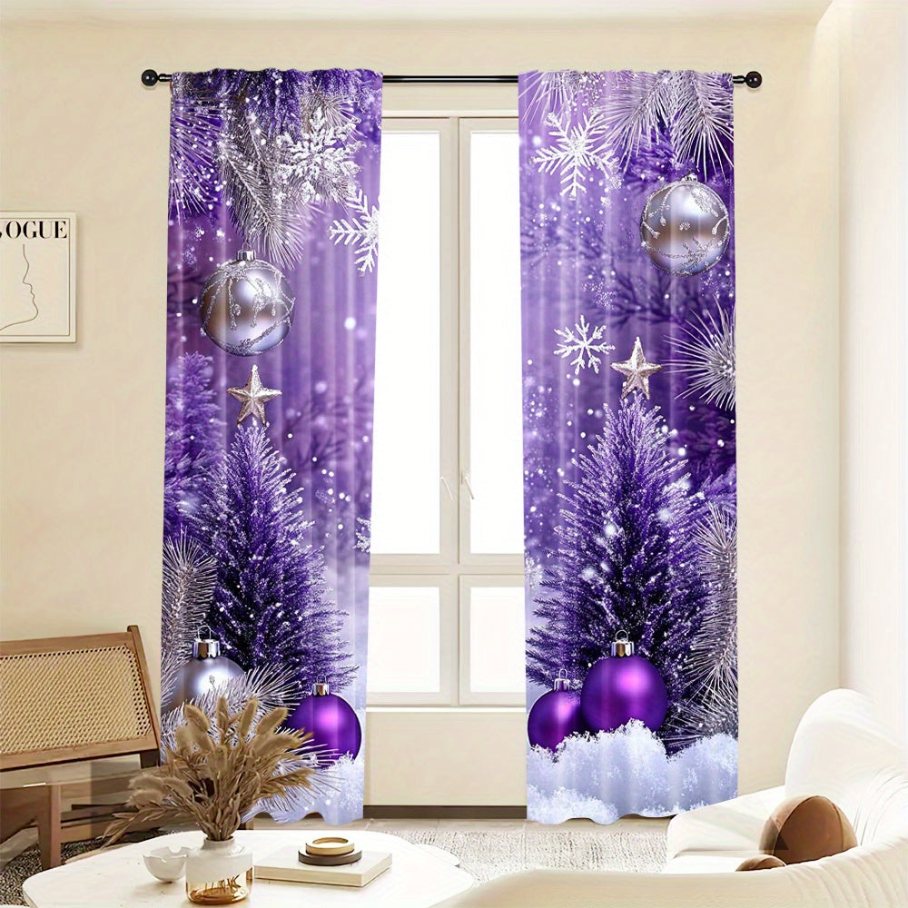 2pcs Set Vibrant Purple & Silvery Christmas Ball Digital Print Curtains - Rod Pocket Design for Living Room, Bedroom, Study Decor - Festive Home Accent (Rod Not Included)
