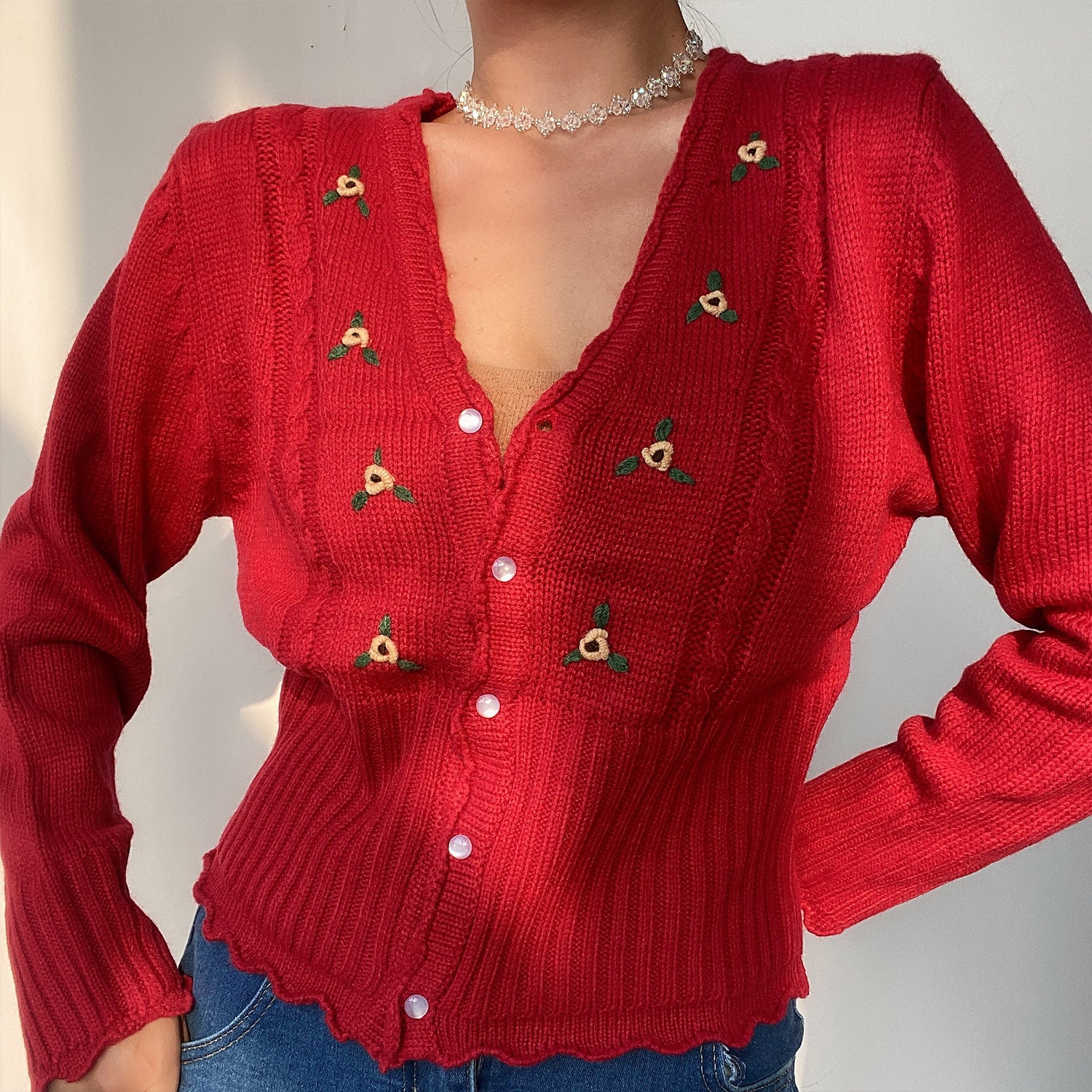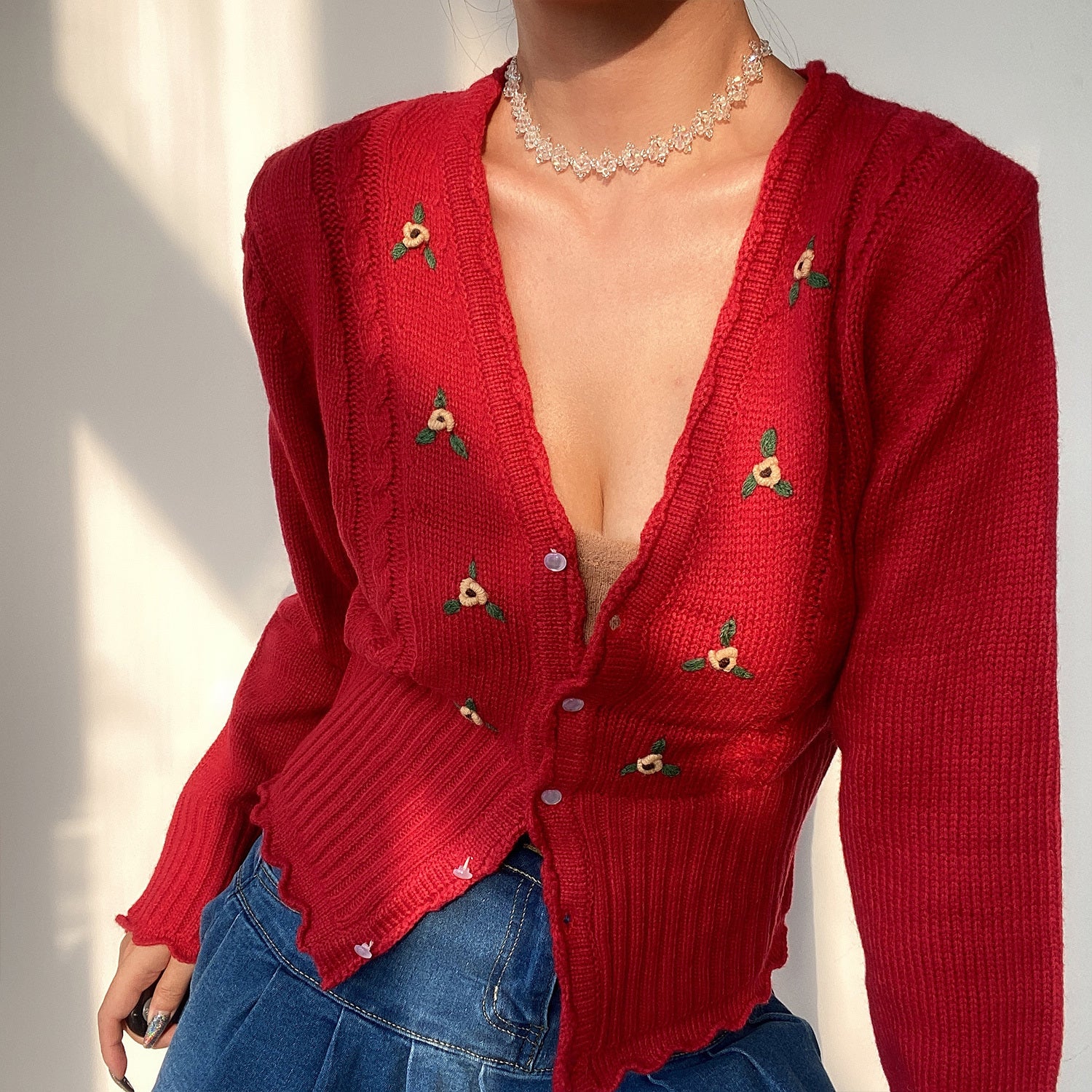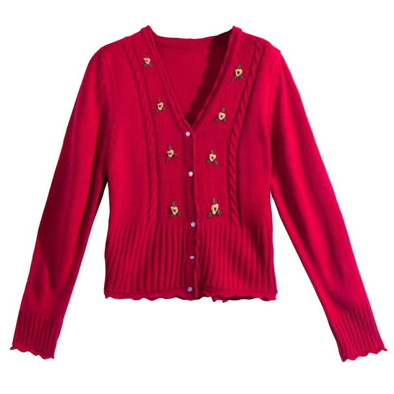 Retro French V-neck Cute Wooden Ears Crochet-breasted Slim Long Sleeve Knit Cardigan Top