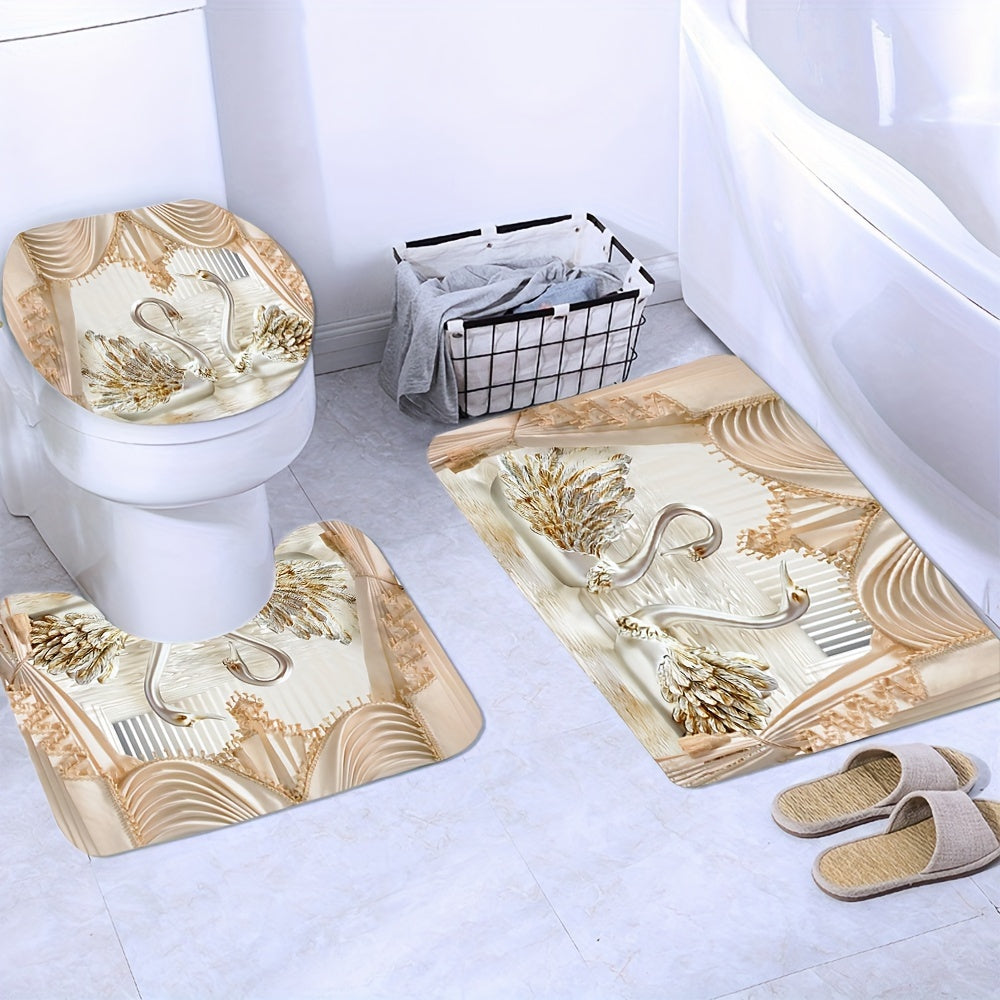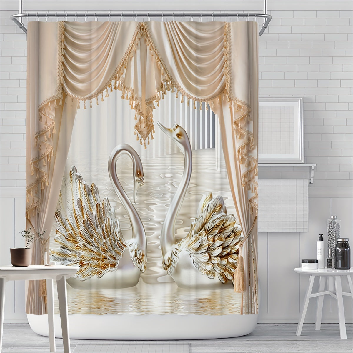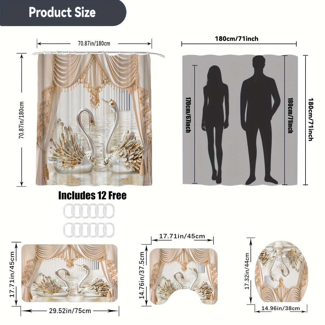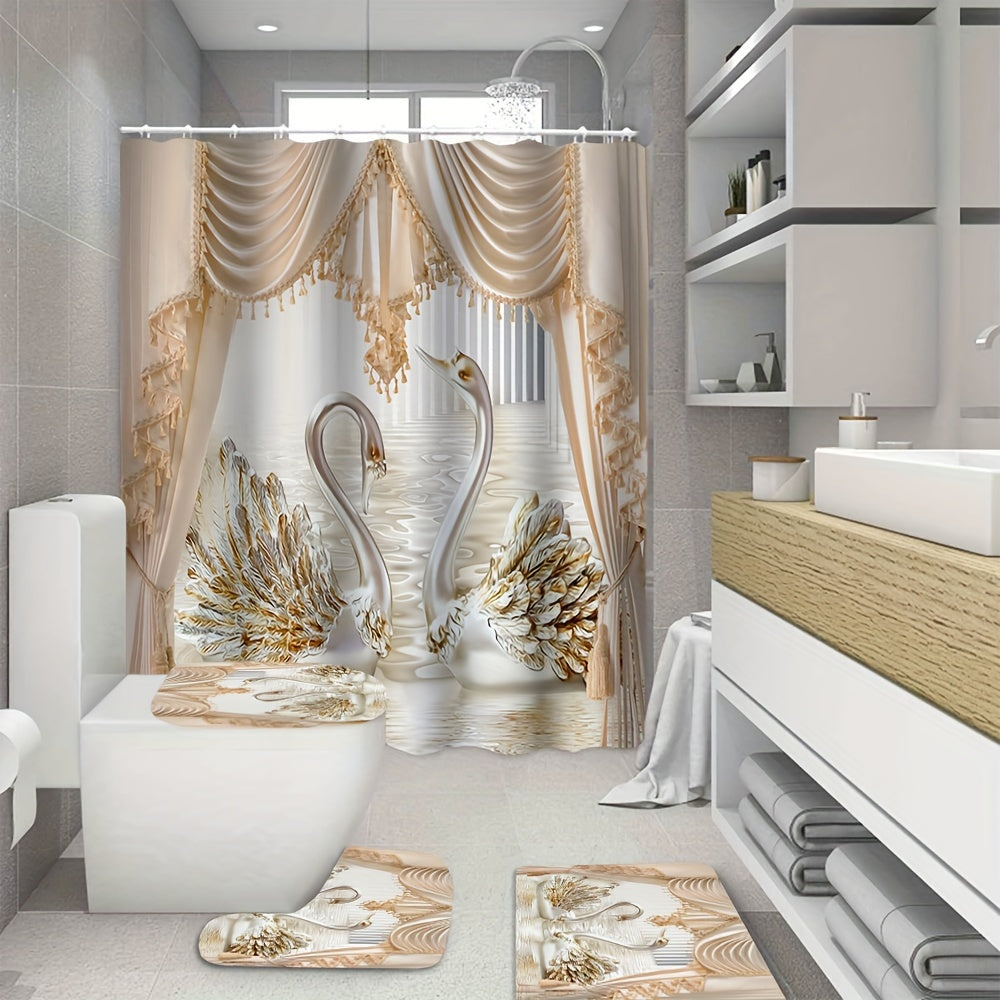 4pcs 3D Swan Print Creative Shower Curtain Set, Decorative Bathroom Set Including Waterproof Shower Curtain, Non Slip Floor Mat, Toilet Lid, Bathroom Mat And 12 Plastic Hooks, Bathroom Accessories, Home Decoration