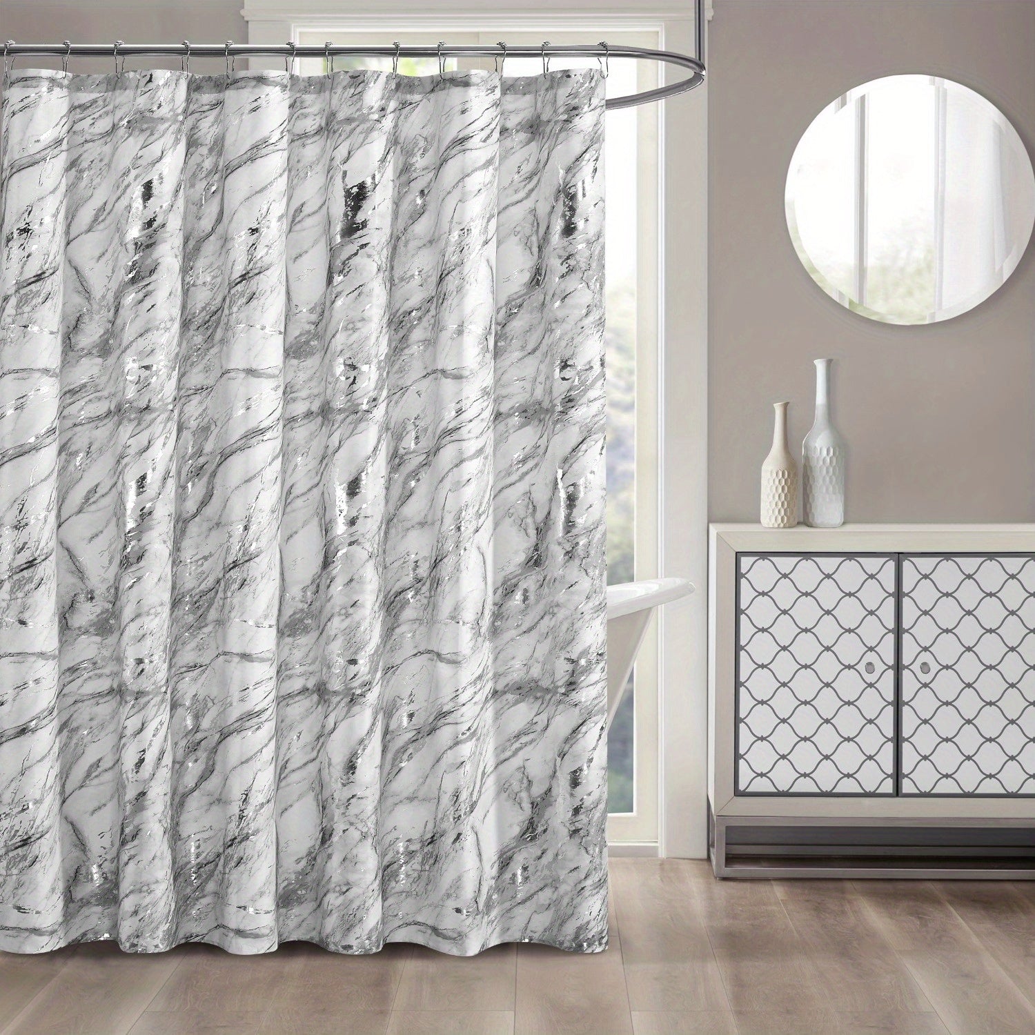 The Metallic Marble Printed 72" X 72" Fabric Shower Curtain Is A Stunning Bathroom Accessory That Combines Style And Functionality. Its Elegant Design Features A Marble-inspired Pattern With Metallic Accents, Adding A Touch Of Luxury To Your Space. Crafted From Durable, Water-resistant Fabric, This Curtain Not Only Looks Great But Also Stands Up To Daily Use. The Standard 72" X 72" Size Fits Most Showers And Bathtubs, Providing Full Coverage To Keep Your Bathroom Dry. With Reinforced Metal Grommets, Installation Is A Breeze. Elevate Your Bathroom Décor Affordably With This Fashionable And Easy-to-maintain Shower Curtain.