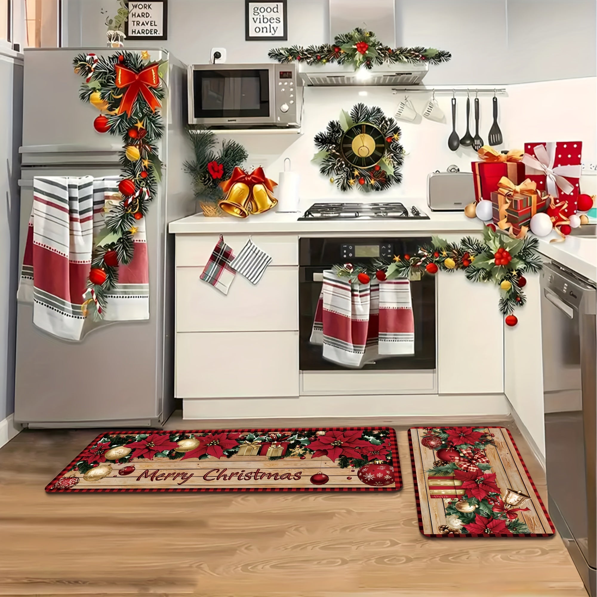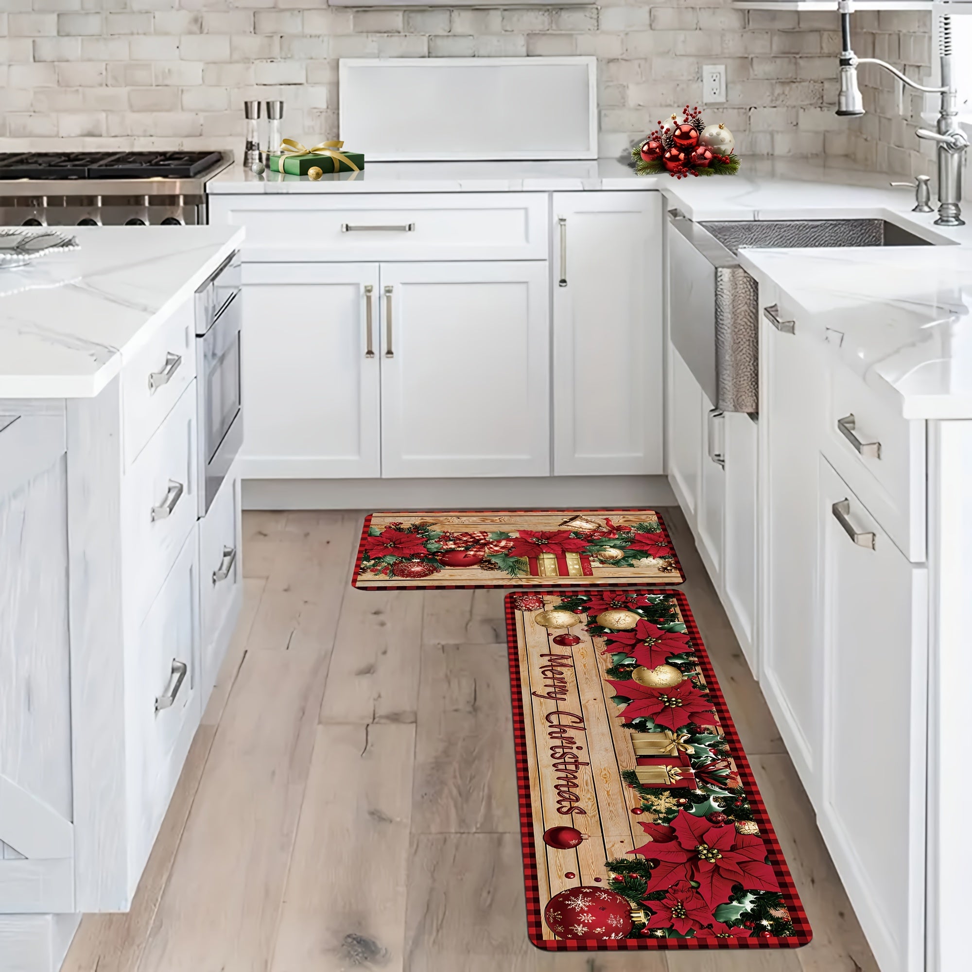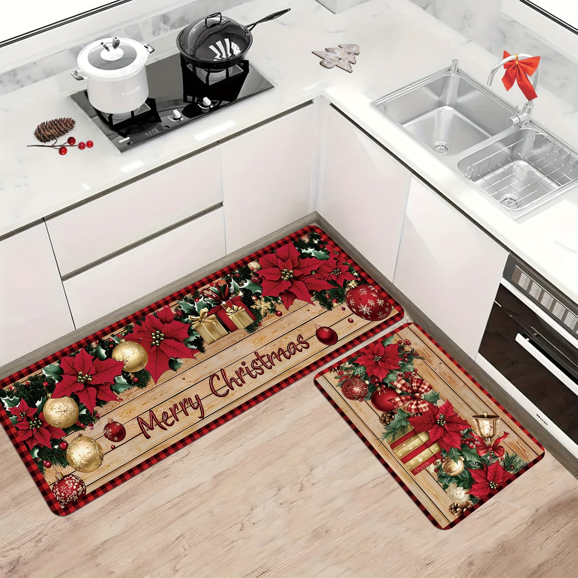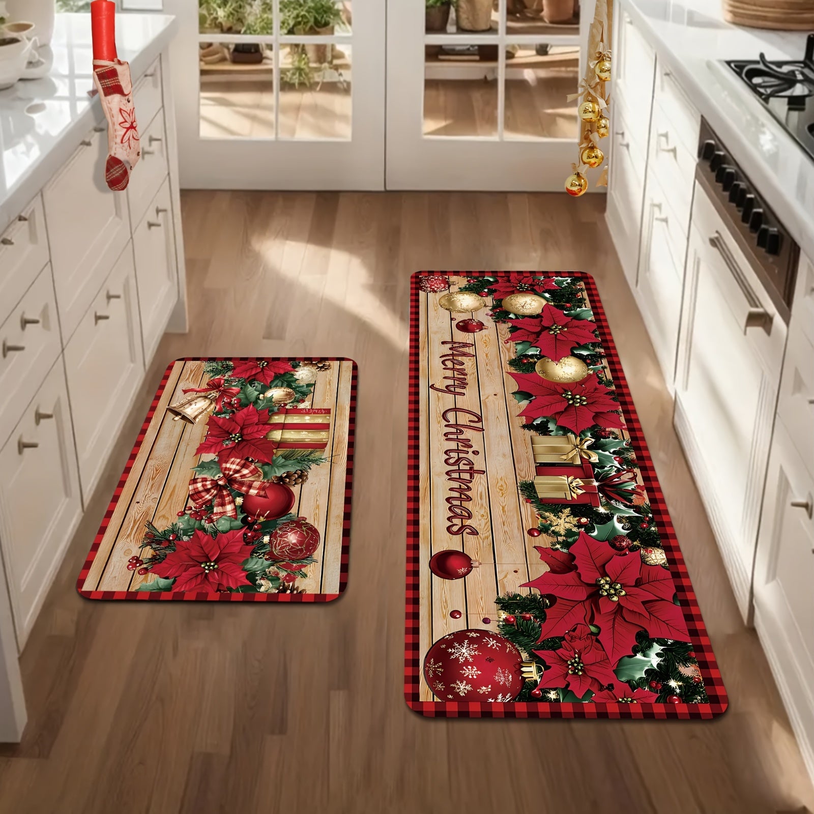 2-Piece Merry Christmas Kitchen Rugs Set - Non Slip, Stain Resistant, Machine Washable Polyester Mats with PVC Backing - Lightweight Rectangular Area Rugs for Home, Dining, Bathroom with Poinsettia and Bell Design