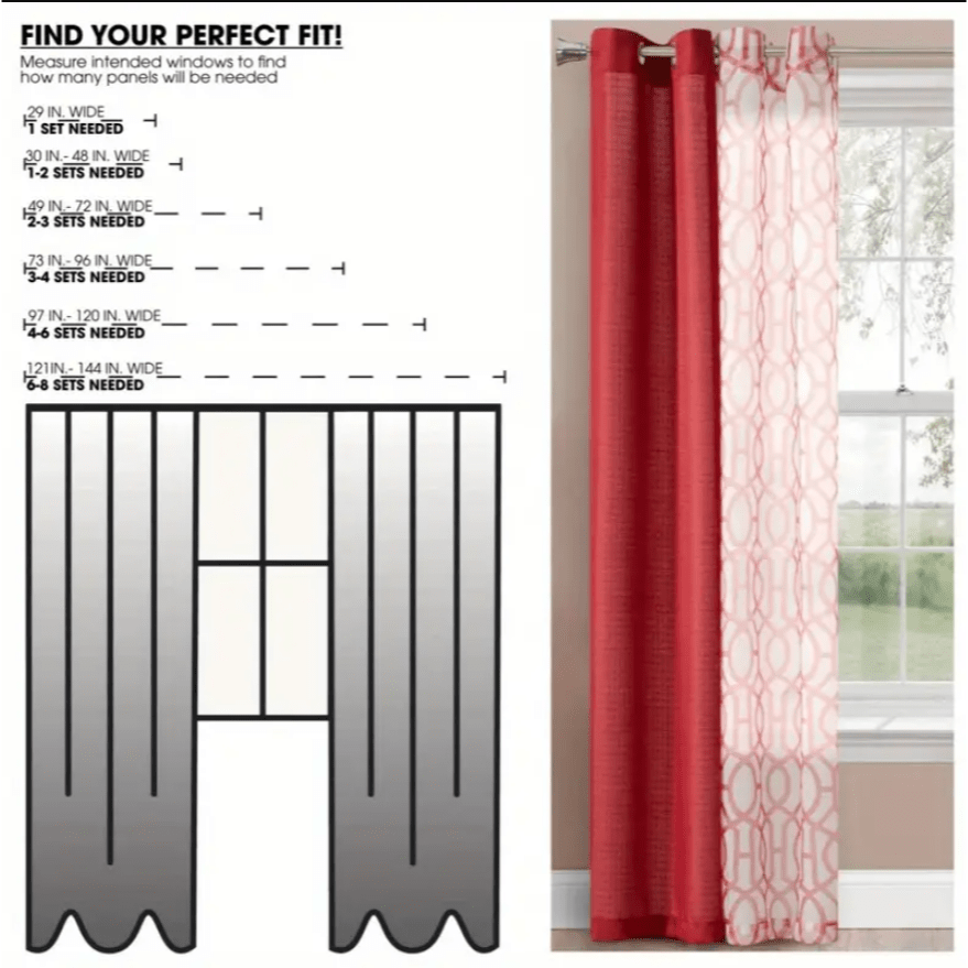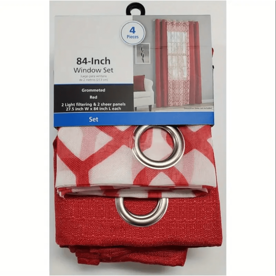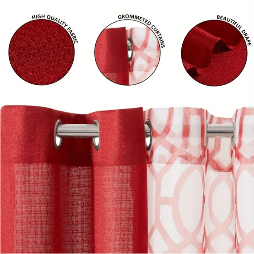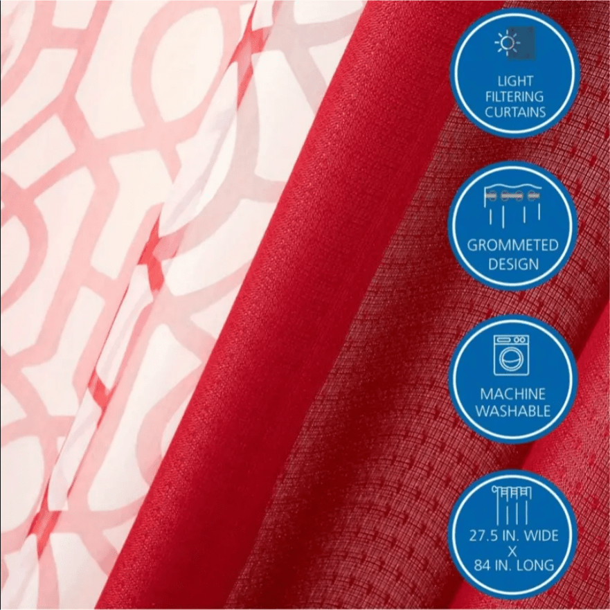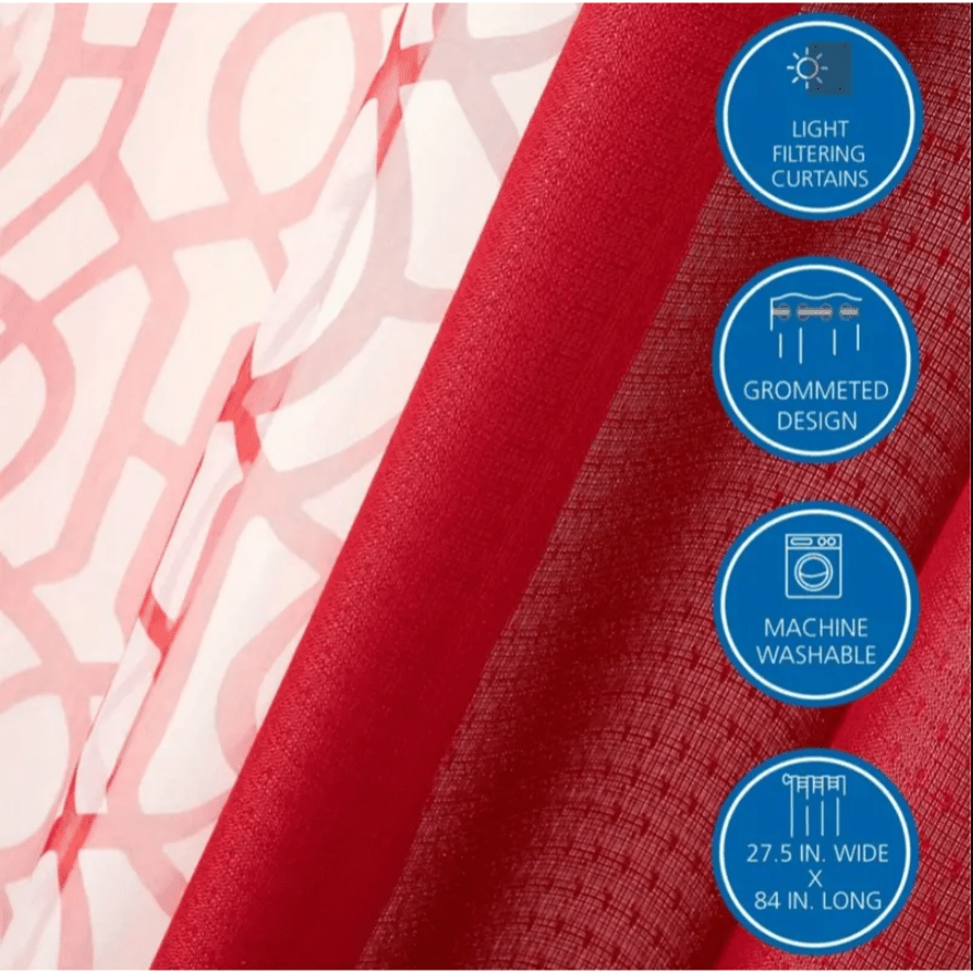 4 Piece Grommet Curtain Set, Red, 27.5" W x 84" L 4pc Window Set 2 Printed Sheers 2 Solid Textured Panels Grommets