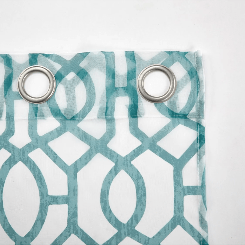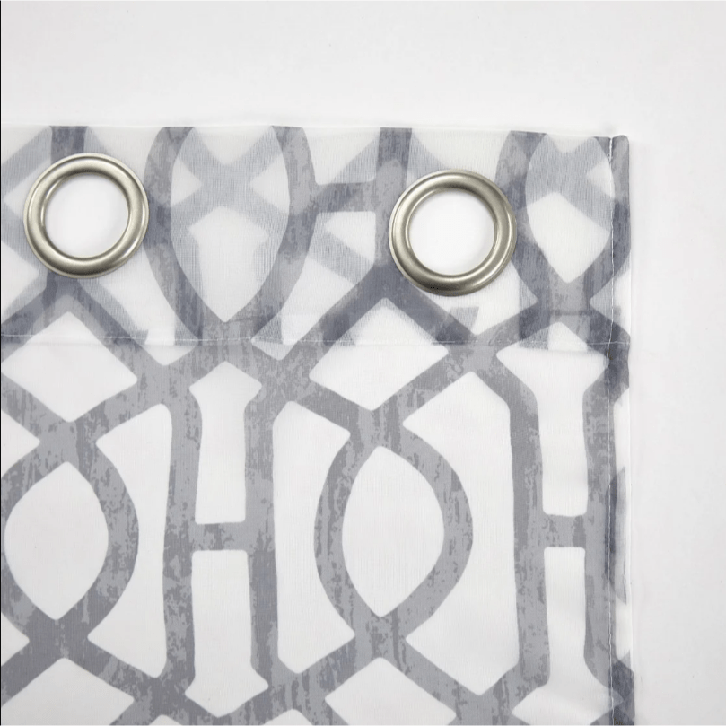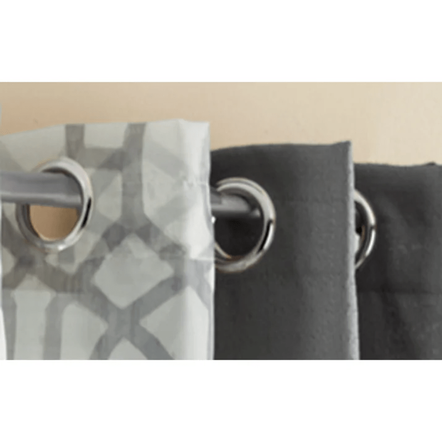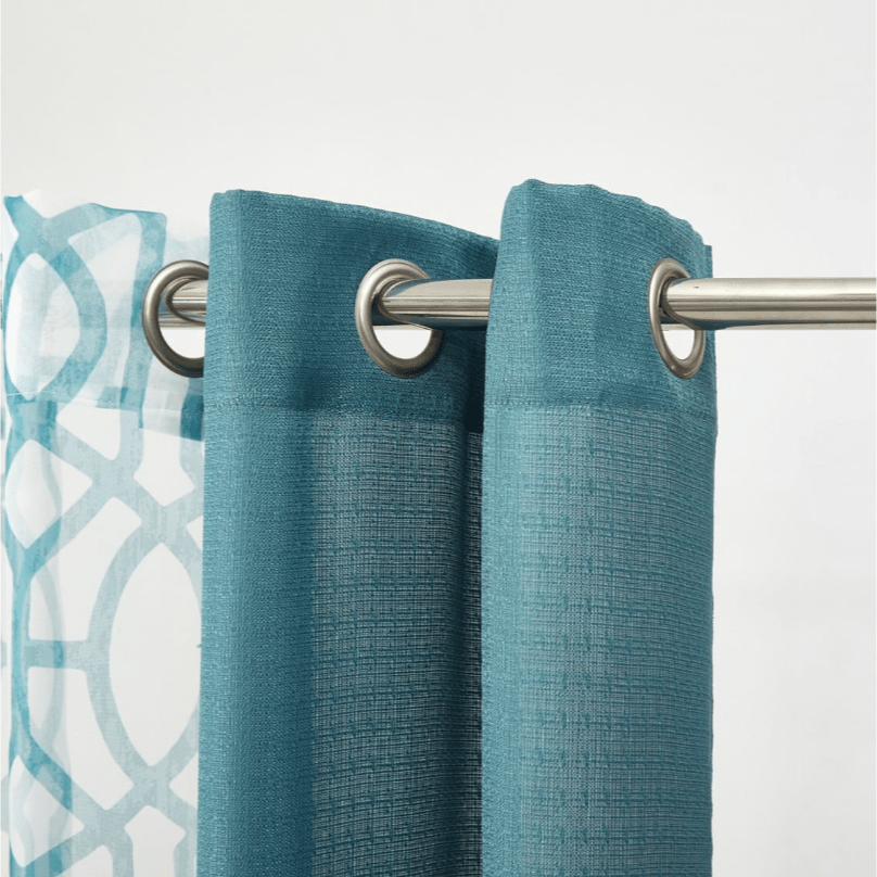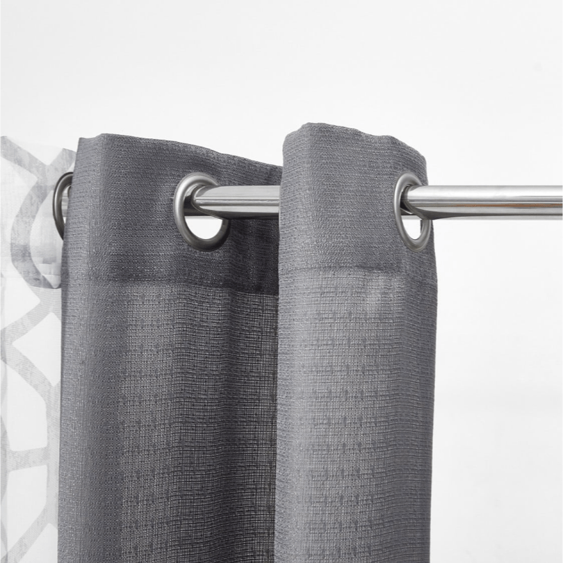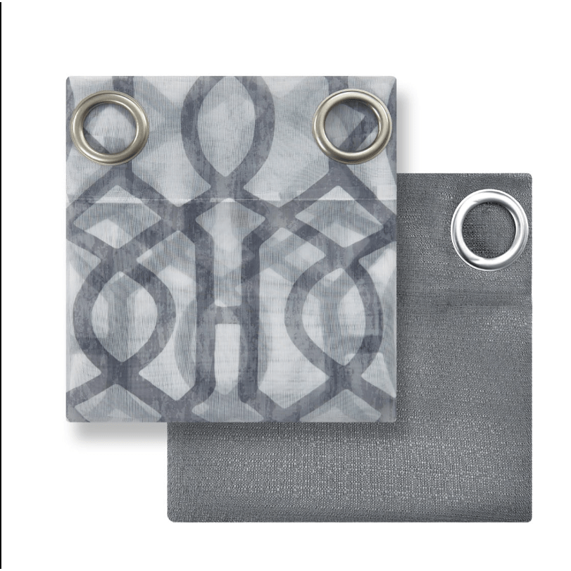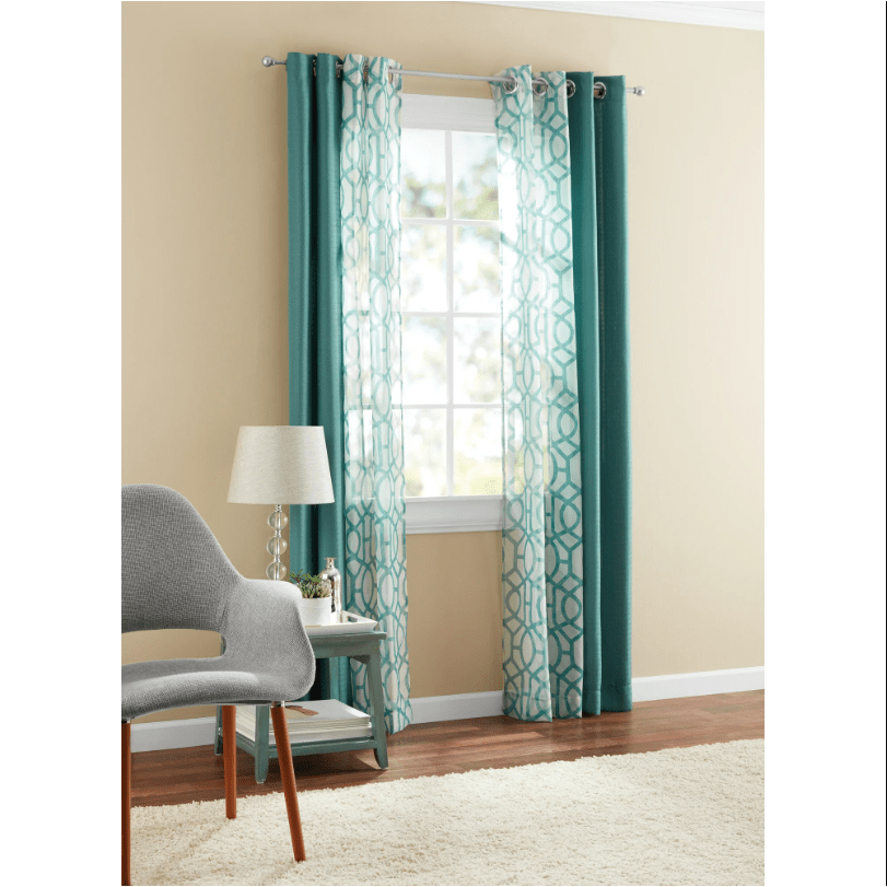 Includes: 2 solid textured panels and 2 sheer printed panels Dimensions per Curtain: 27.5” W x 84” L Hanging Style: Rod pocket top treatment; fits rod up to 1.5” in Diameter Light Filtration: Light filter Material: 100% Polyester Care: Machine washable Country of Origin: Imported Why You’ll Love It: Each panel filters light while creating privacy in the room; contrasting solid colors and sheer geometric prints Style Tip: For windows you open often, choose sill length. For a casual look, let the fabric fall a few inches below the window. For a tailored or dramatic look, choose floor length curtains to make your windows a focal point. Note: Tiebacks sold separately