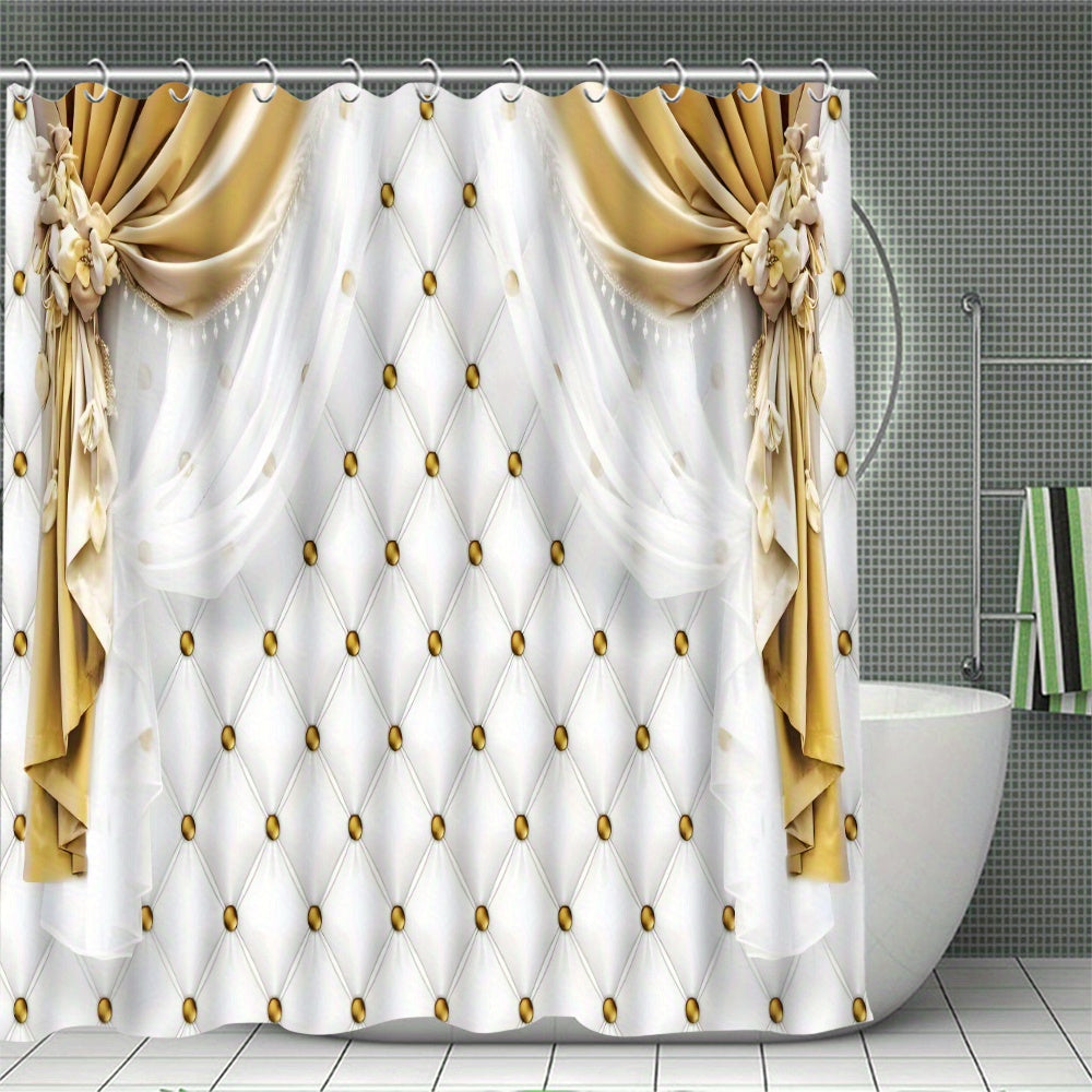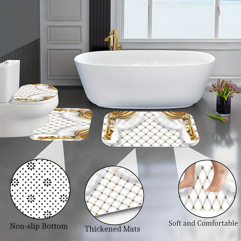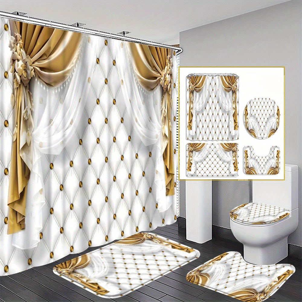 4pcs three piece Modern 4-Piece White Gold Lace Shower Curtain Set with Hooks and Toilet Mat for Bathroom Decor