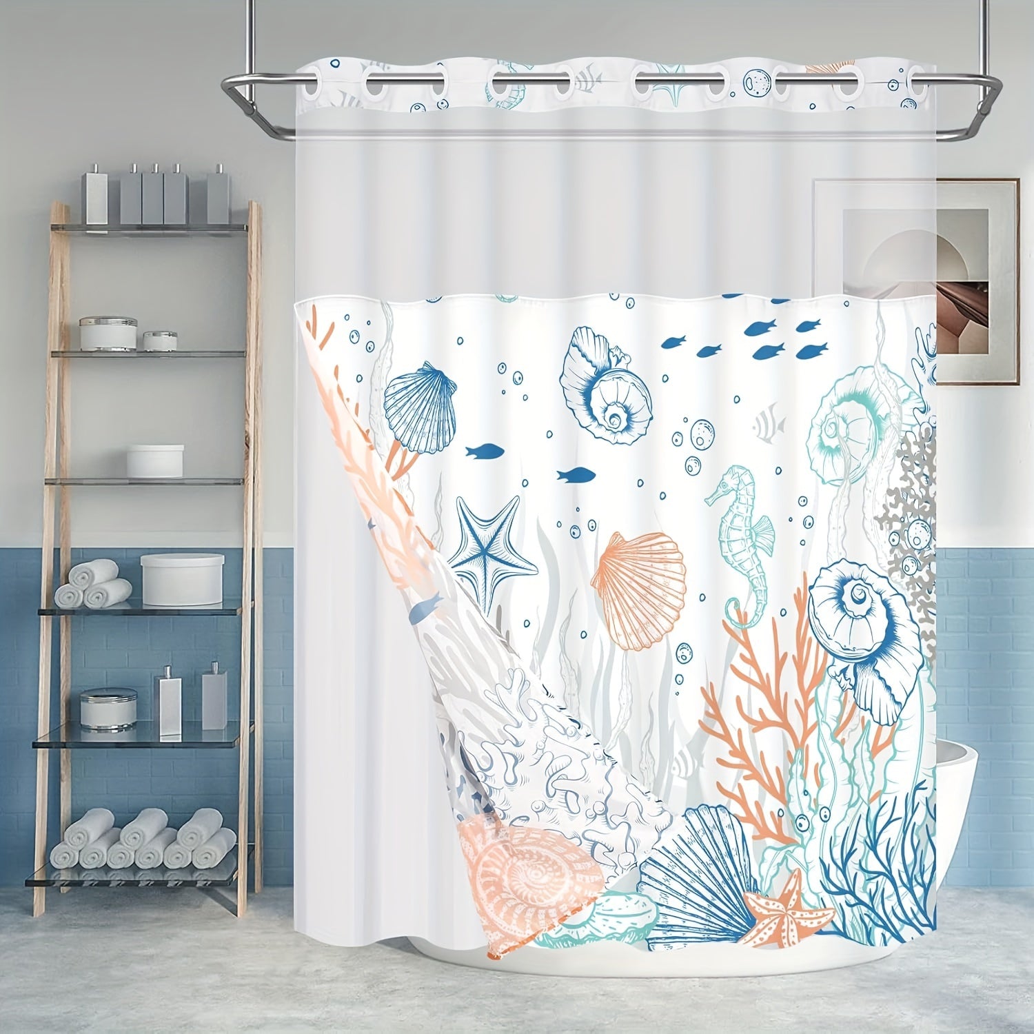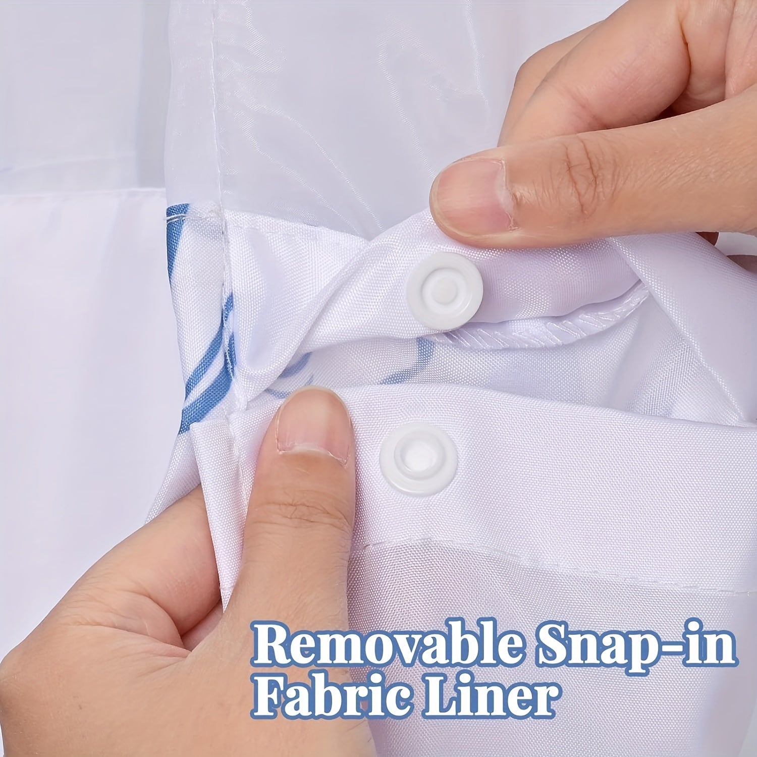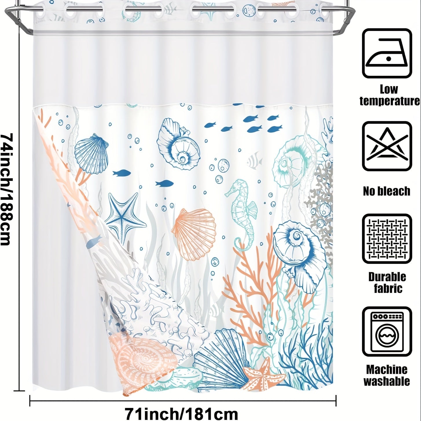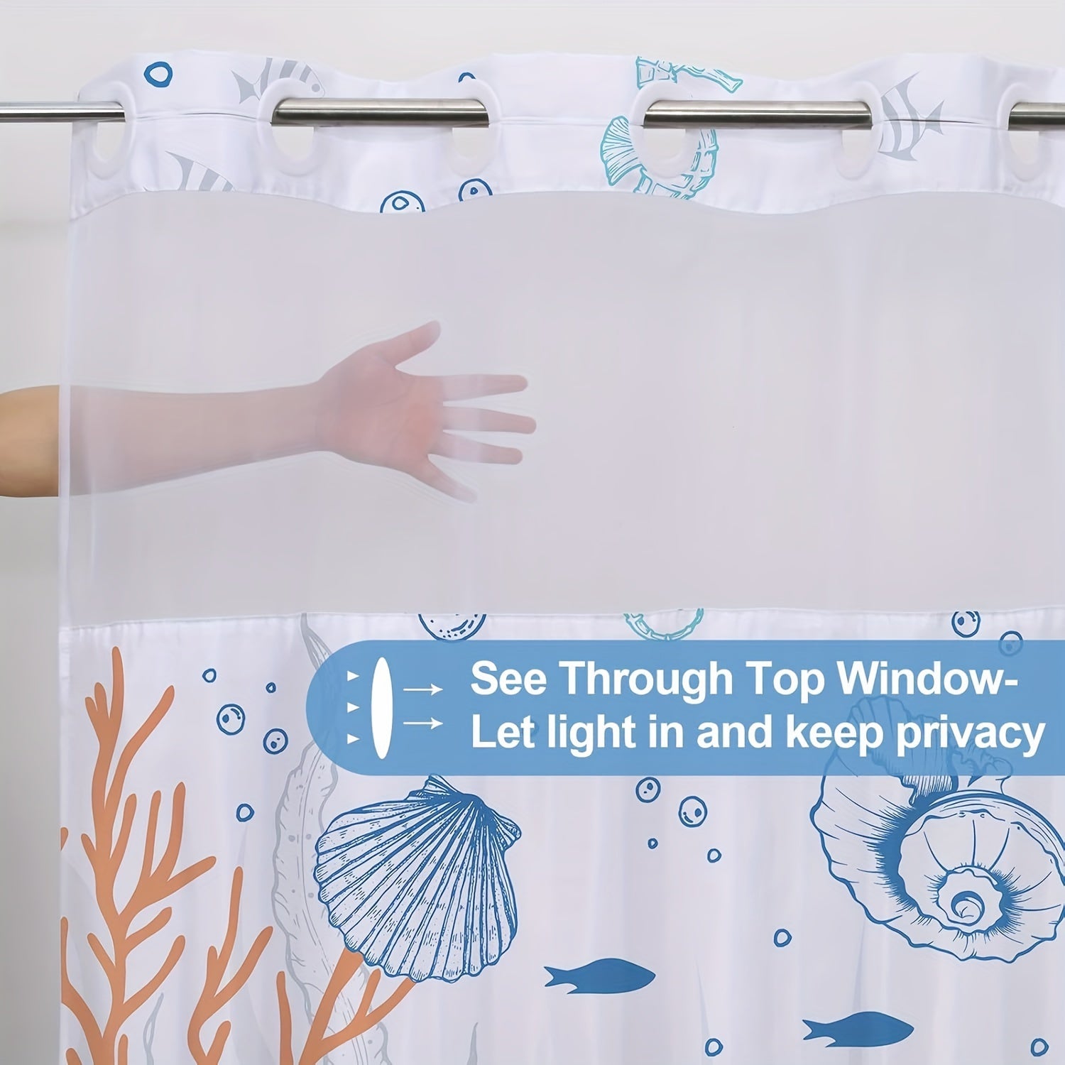 Coastal No Hook Shower Curtain With Snap In Liner, Nautical Beach Shower Curtain With Liner, Hotel Style Shower Curtain With See Through Top Window, Double Layer, Waterproof, 71" X 74"