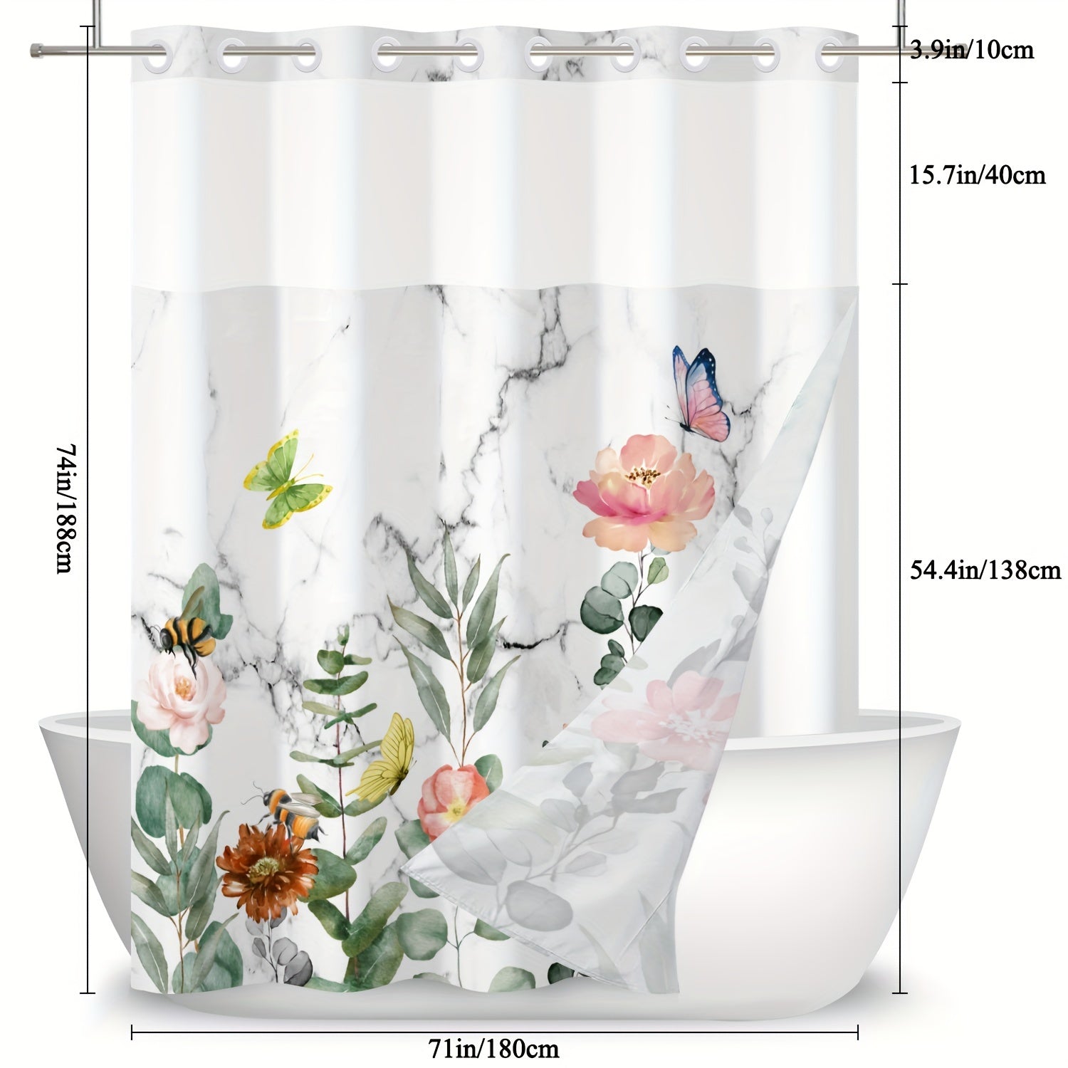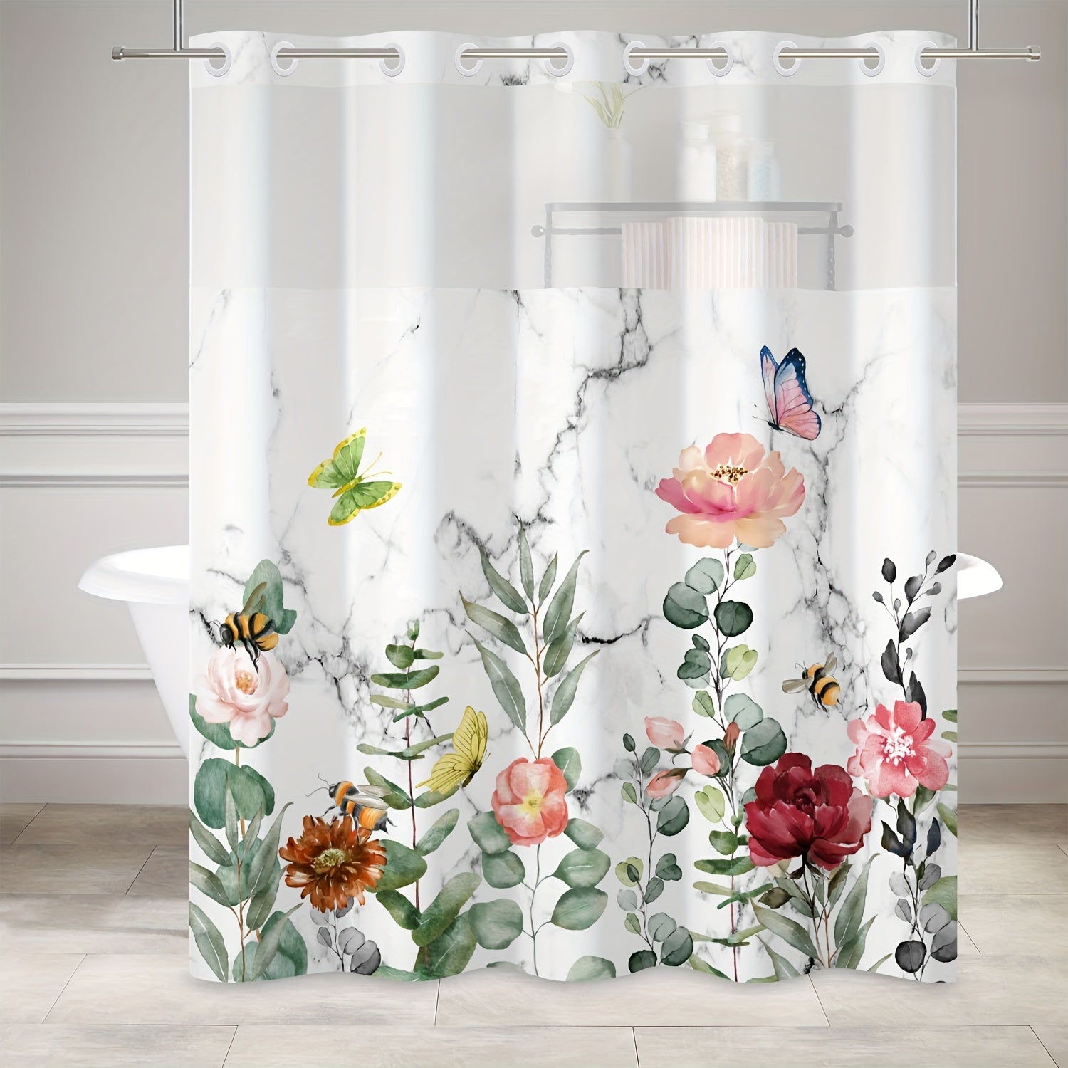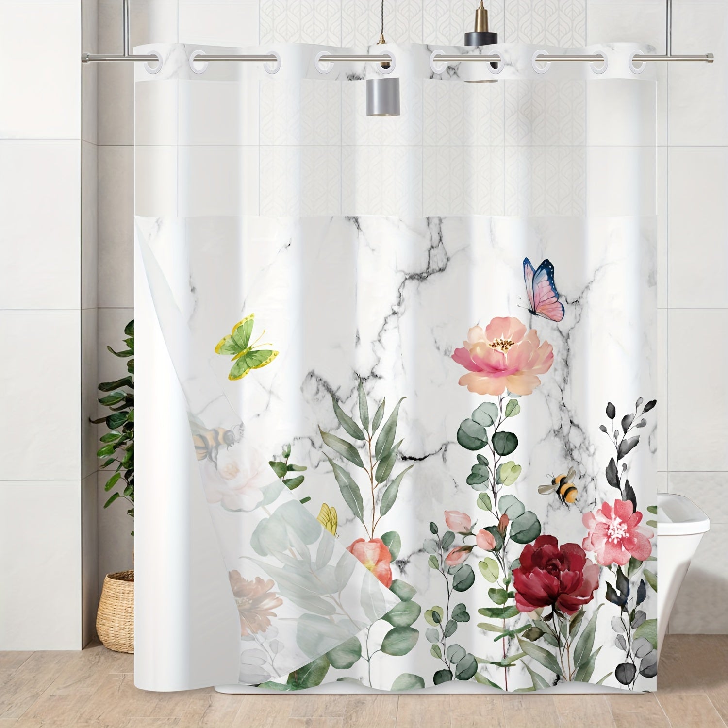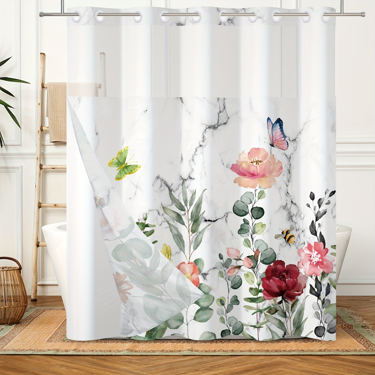 Double Colorful Floral Shower Curtain Set, No Hook Shower Curtain With Snap In Liner & See Through Mesh Top Window, Red Flowers White Marble Shower Curtain, No Hooks Needed Shower Curtain Bathroom Hotel 71x74 Inches