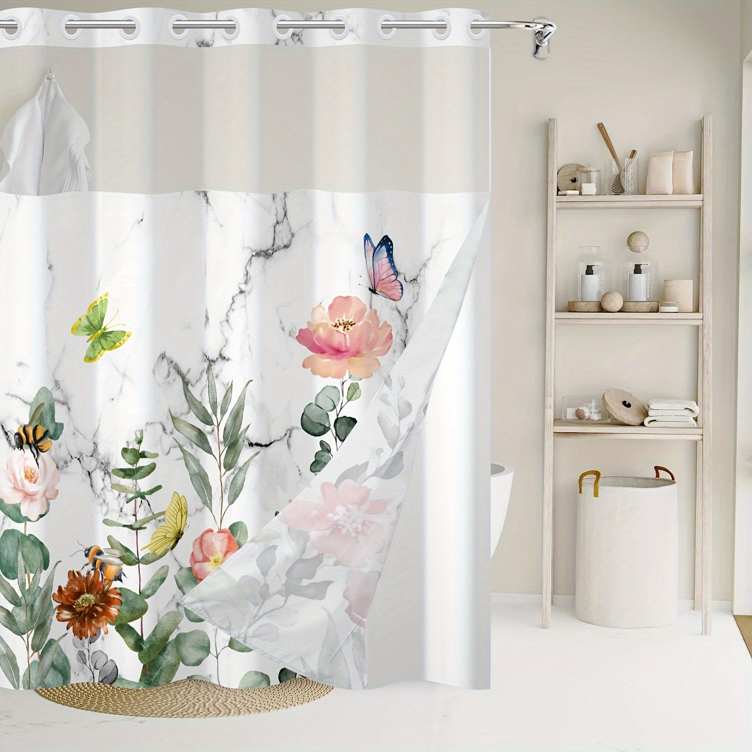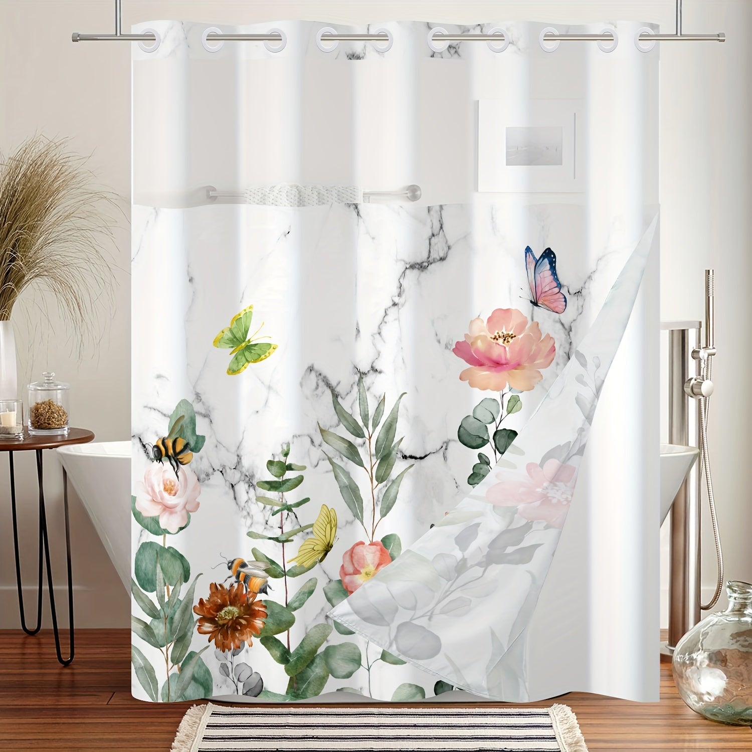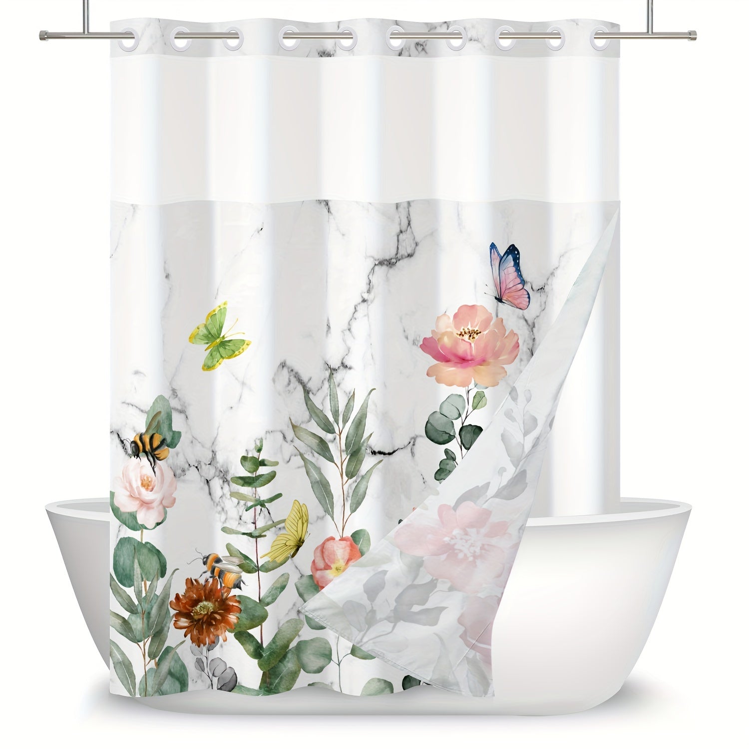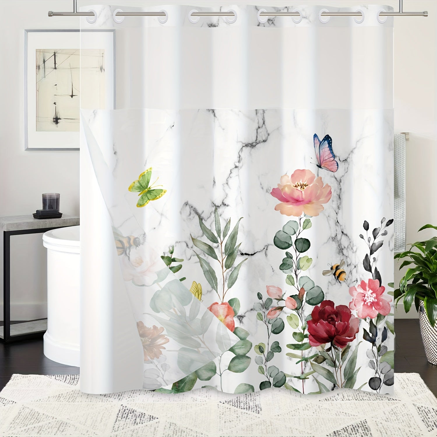 Double Colorful Floral Shower Curtain Set, No Hook Shower Curtain With Snap In Liner & See Through Mesh Top Window, Red Flowers White Marble Shower Curtain, No Hooks Needed Shower Curtain Bathroom Hotel 71x74 Inches