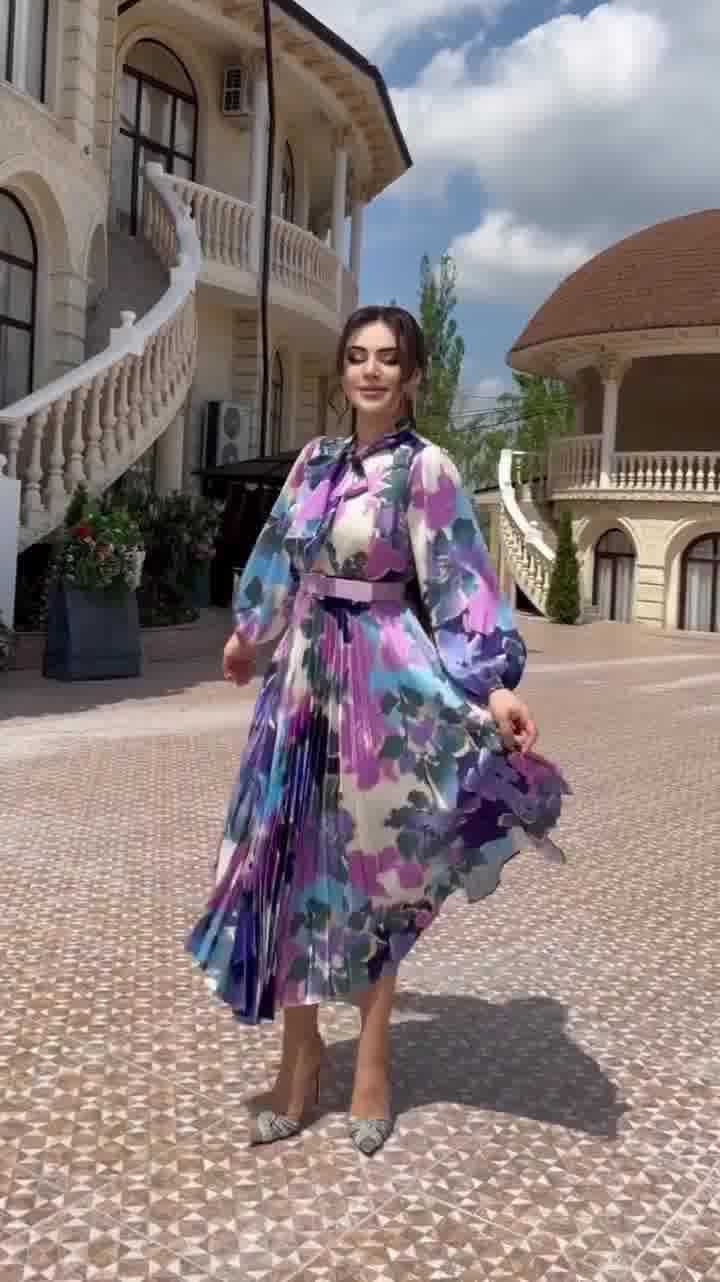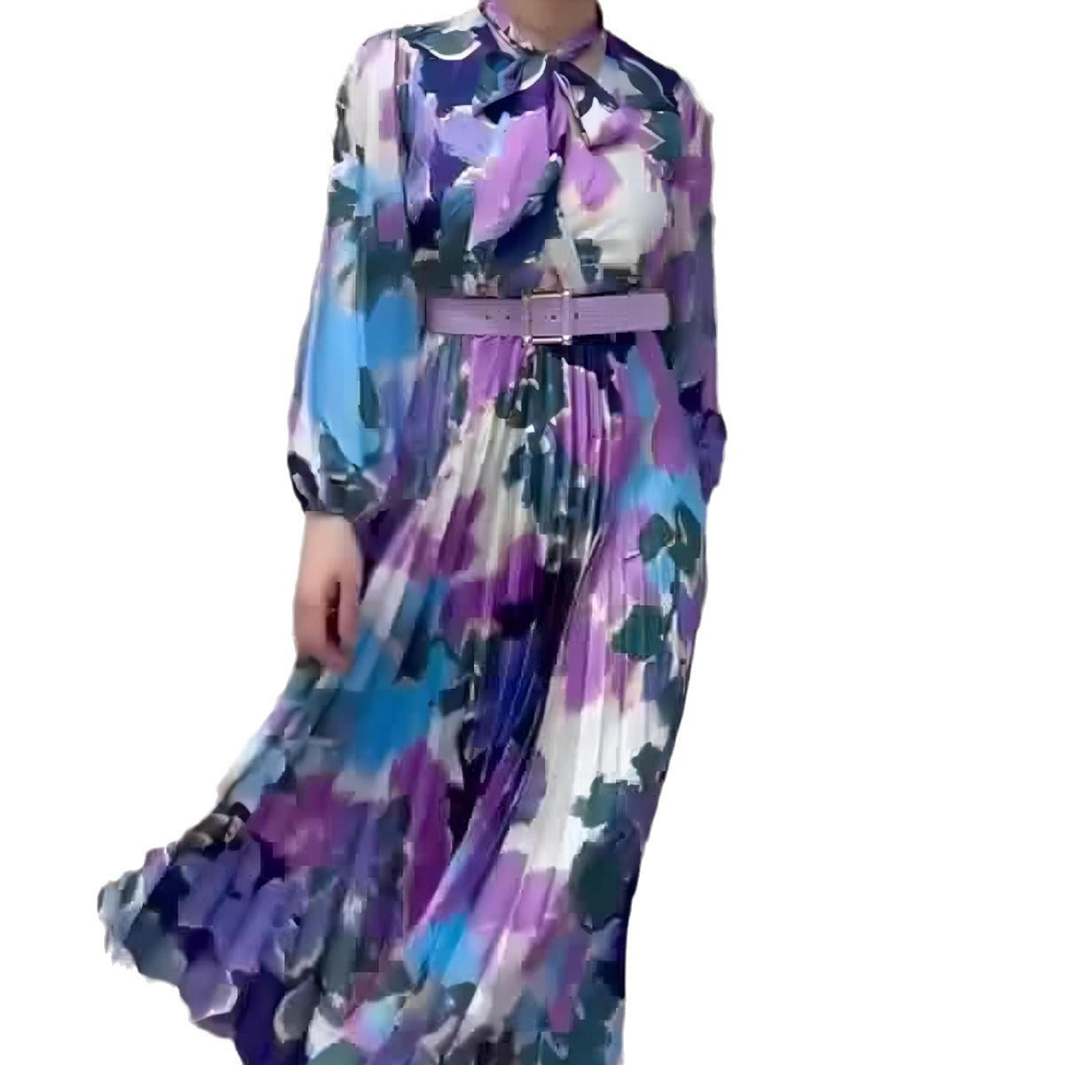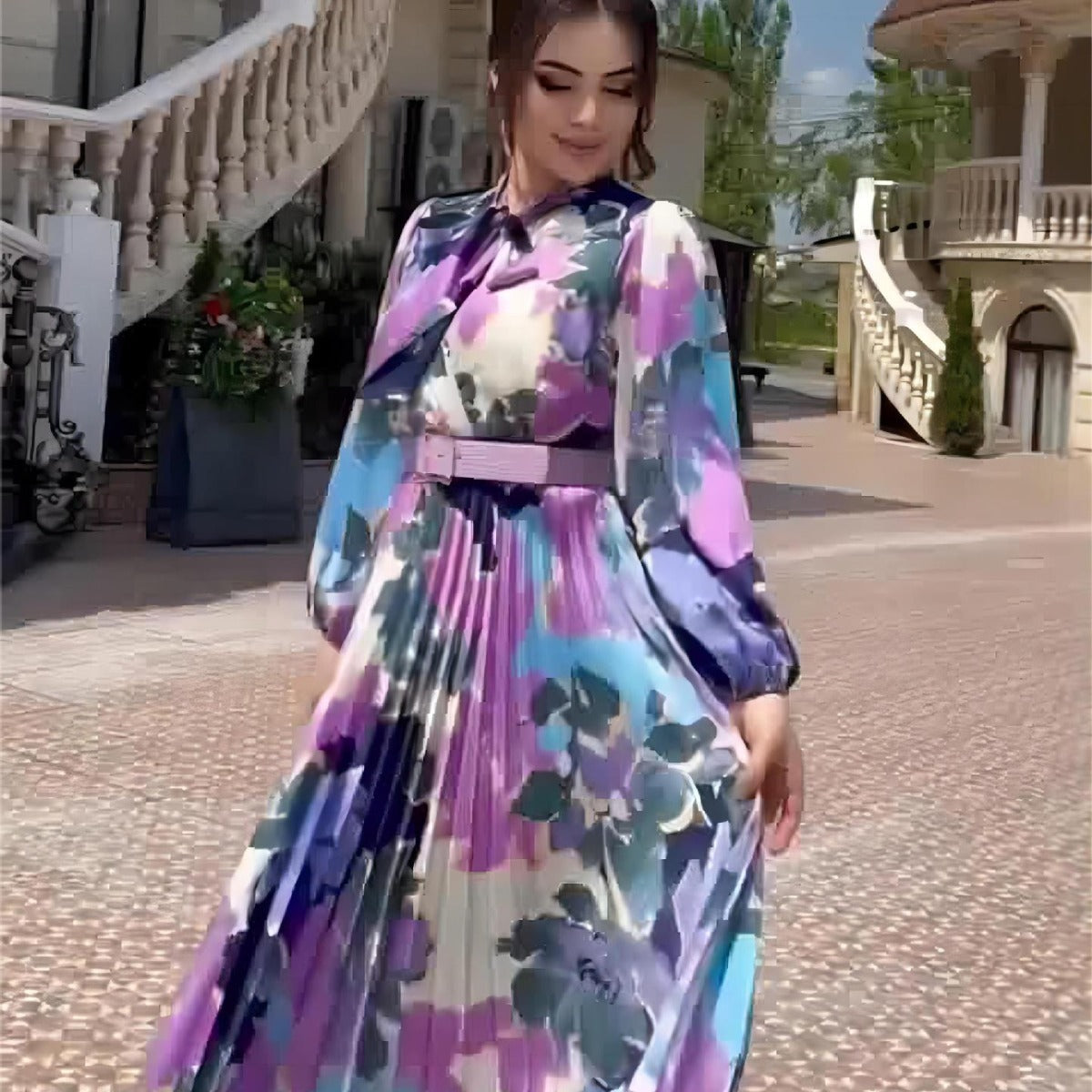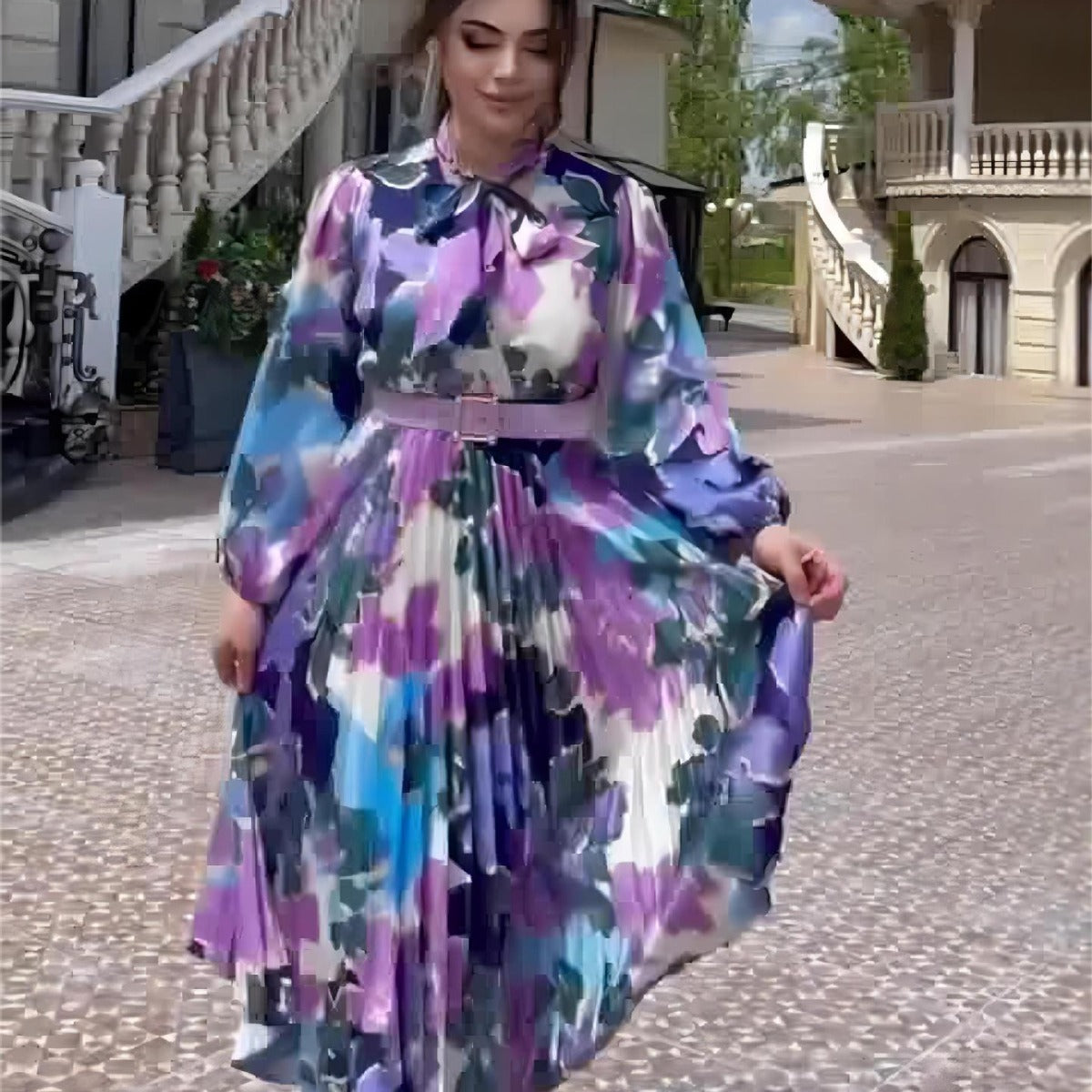 Women's Scarf Collar Graceful Puff Sleeve Waist Trimming Printing Design Sense Dress